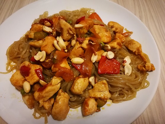 Kada se skuvaju, a to je posle 8 minuta, stavite u cediljku. sada je već povrće proprženo, dodajte kašiku one (gore navedene) paste, soja sosa po ukusu, dodajte piletinu i na kraju nudle. Sve lepo promešajte i eto vaše jelo je gotovo za 30 minuta.