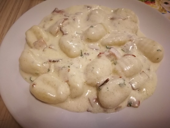 Kada je slaninica dobro pržena sklonite tiganj sa ringle i dodajte 50 gr nekog plavog sira i mešajte dok se sir ne istopi. Sada vratite sve na vatru i dodajte ½ l pavlake za kuvanje. U sve to dodajte one njoke, koje ste procedili, posolite malo, možete dodati bibera, peršuna ili još nekog začina, po volji i želji.