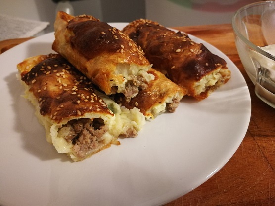 Na svaku (a koristite samo jednu) koru stavite kašiku fila od jaja i pavlake, premažete veći deo kore i stavite pri kraju mleveno meso. Uvijate tanak rolatić i ređate u pleh jedan do drugog. U pleh naravno prvo stavite pek papir.
