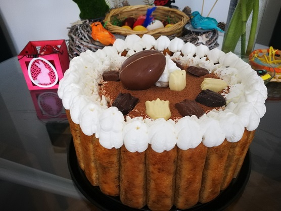 Uskršnja trpeza pored ofarbanih jaja treba, bar je takav običaj, da ima i tortu. Dugo sam smišljala koju ću praviti i izbor je pao na tiramisu, ali sam ga pravila kao okruglu tortu, malo mi  je svečanije. Ovom prazniku se radujem i pripreme za njega kreću od Velikog petka kada farbam jaja.