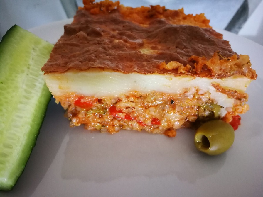 Znači potrebno je meso, dve pečene crvene paprike, šolja poluskuvanog pirinča, glavica crnog luka, polovina rendanog brokolija, šolja iseckanih zelenih maslina, soka od paradajza (najmanje 1/2 l), 150 gr kačkavalja i krompir od koga ćete napraviti pire krompir.