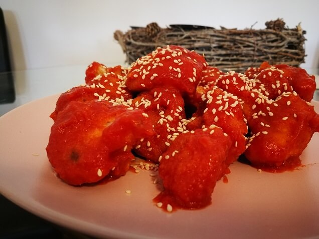 Sos sam napravila od više vrsta paradajza. U tiganj sam stavila vrlo malo ulja, dodala kečap, sok od paradajza i kineski slatko-ljuti sos (on u sebi ima začine i beli luk). Sve vrste soseva pa i njihova količina je vaša volja i sve je proizvoljno. Kad se sosevi ugreju, uz mešanje, dodajte karfiol, malo uvaljajte u sos, sa svake strane, to je važno. Preko gotovog karfiola sam stavila susam.