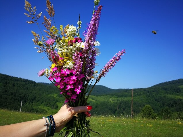 Kada sam već spomenula cveće ne mogu da ne spomenem poljsko cveće koga ima u izobilju. Nisam prvi put na selu ali ovoliko vrsta poljskog cveća na jednom mestu nikada pre nisam videla. Tako je nastao jednog dana i ovaj prelepi buket a na fotografijama možete videti dobar deo cveća sa obližnjih livada. Među cvećem i lekovitim biljem, neke sam prepoznala (kantarion, hajdučka trava, nana i bokvica) naziru se svuda okolo uz staze šumske jagode i po neka pečurka. Cvrkut raznih ptičica nas je pratio sve vreme šetnje, kao da su se takmičile međusobno koja će biti glasnija i zadobiti više naše pažnje. Čak i noću kada sve utihne i priroda utone u san čula bi se neka, tek da malo prekine tišinu, da nas podseti na to gde smo.
