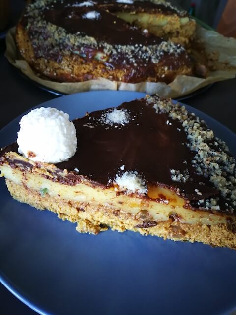 Prelijete sve preko pudinga, ukrasite po želji. Ja sam po obodu stavila mleveni orah a po sredini malo kokosov brašna, stvar mašte.