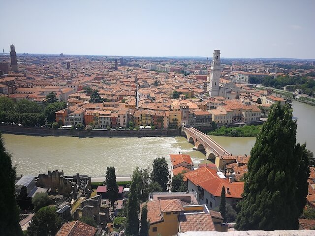 SledeÄe Å”to me oÄaralo je pogled sa dvorca San Pietro (Svetog Petra), do koga se dolazi najstarijim Ā rimskim mostom u Veroni Ponte Pietra, koji prelazi preko reke AdiÄe. InaÄe ova reka krivuda kroz ceo grad, prolazeÄi ispod mostova, trgova i ostalih znamenitosti. Do dvorca se može doÄi peÅ”ice, stepeniÅ”tem, mi smo odabrali lakÅ”i put i to uspinjaÄom. Karta za uspinjaÄu u jednom smeru koÅ”ta 2 evra.