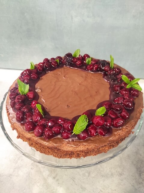 Kada su se torta a i višnje skroz ohladili ukrasila sam tortu po obodu filom od višanja i dodala par listova nane, iz moje bašte 😉.