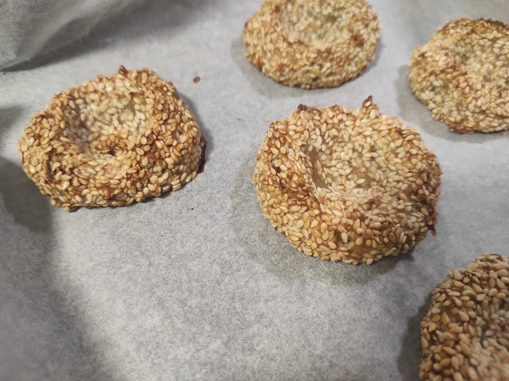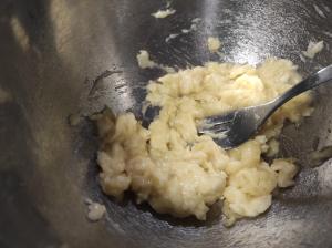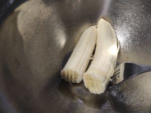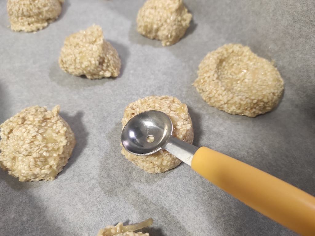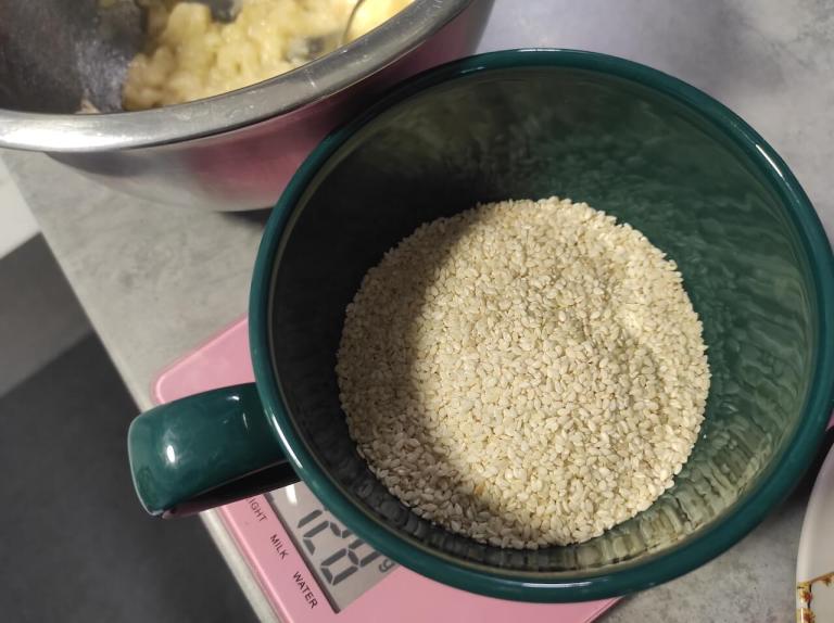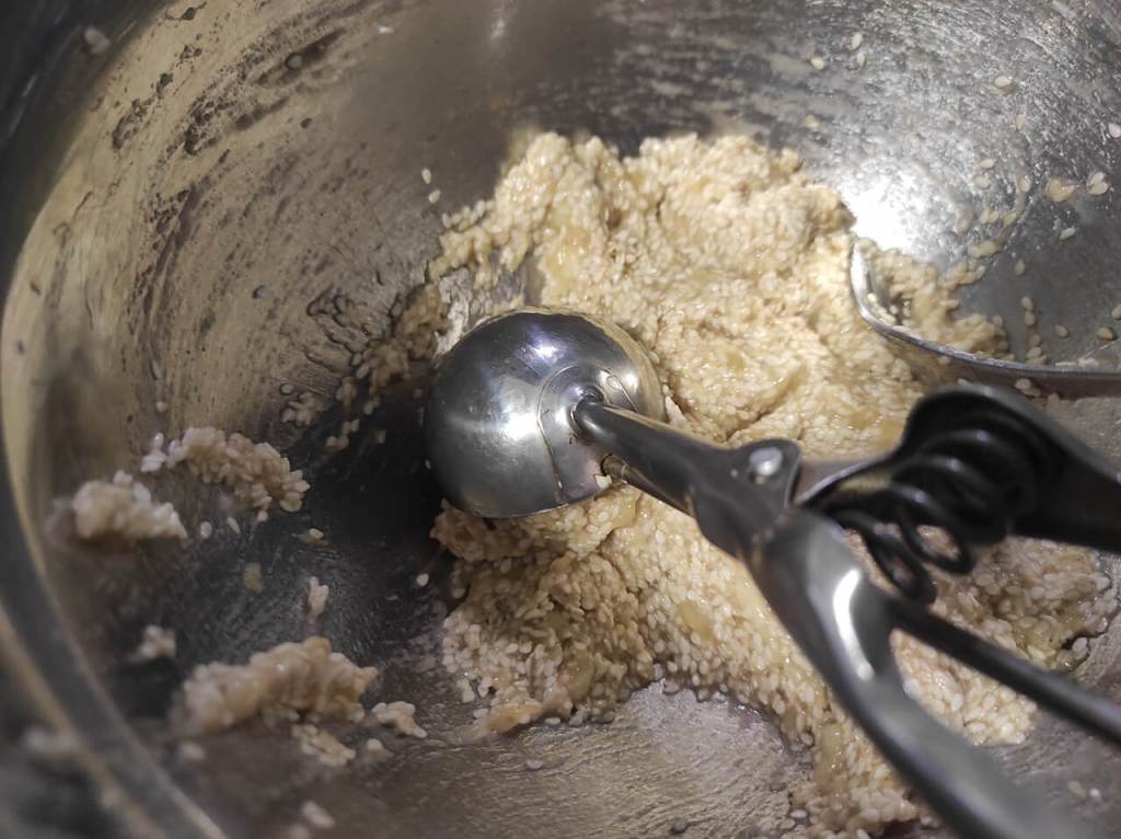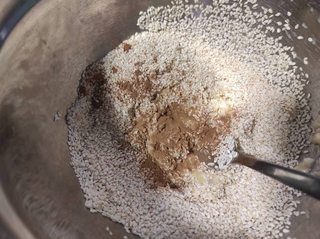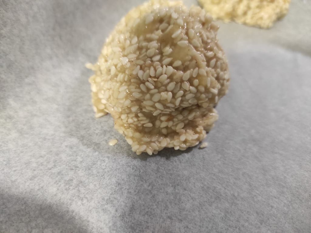 Kada ste bananu usitnili (lakše je kad je banana zrela, moja i nije bila), dodajte 120 gr susama. E sad, ima nekih recepata sa prepečenim susamom, ali ja sam stavila sirovi. Lepo sjedinite ta dva sastojka i vadite loptice (kašikom ili vadilicom za sladoled).