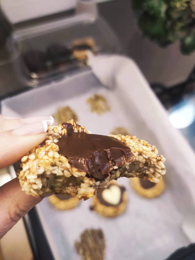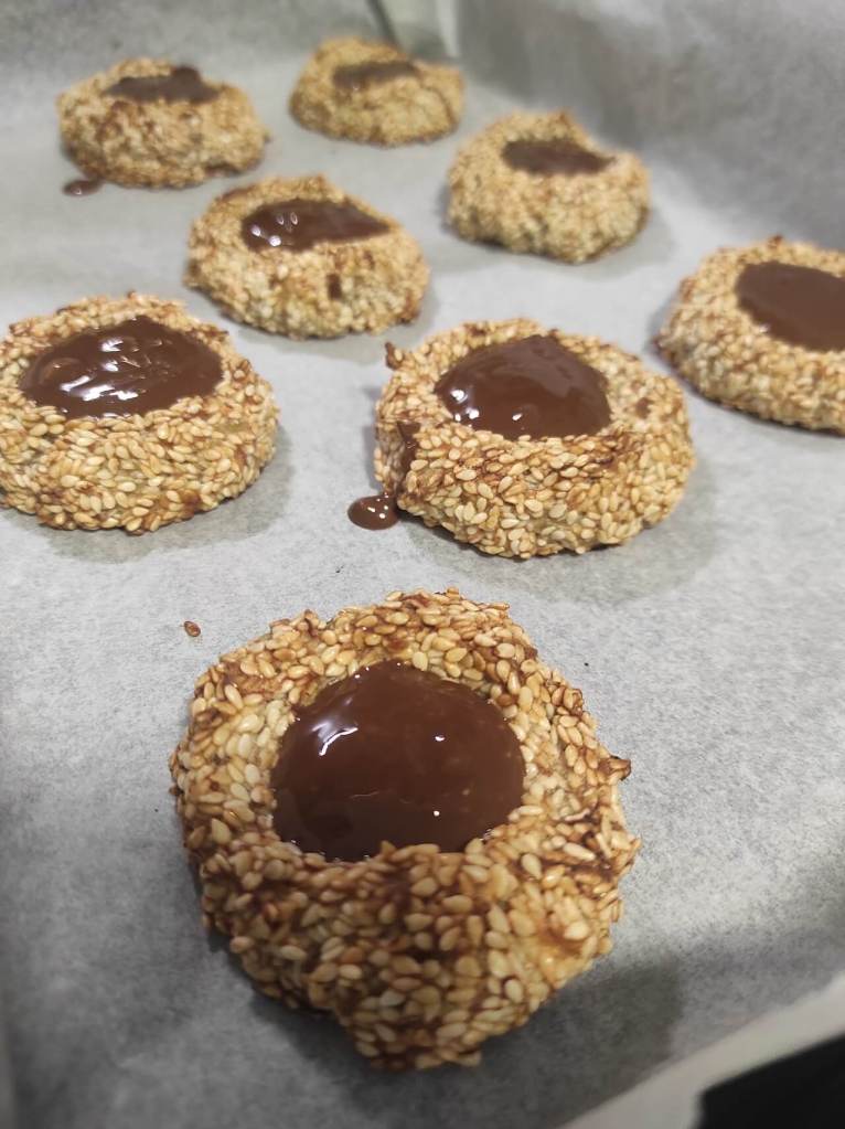 Pecite na 180 stepeni nekih 20 do 25 minuta, u zavisnosti od vaše rerne. Za vreme dok se kolačići peku istopite crnu čokoladu na pari. Na 50 gr čokolade stavite jednu kašiku ulja i otopite. Ja sam u istopljenu čokoladu dodala jednu kašiku kikiriki putera, ne mora.