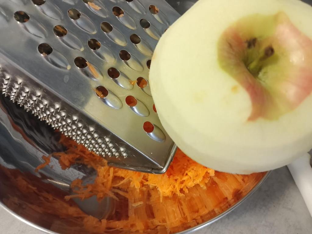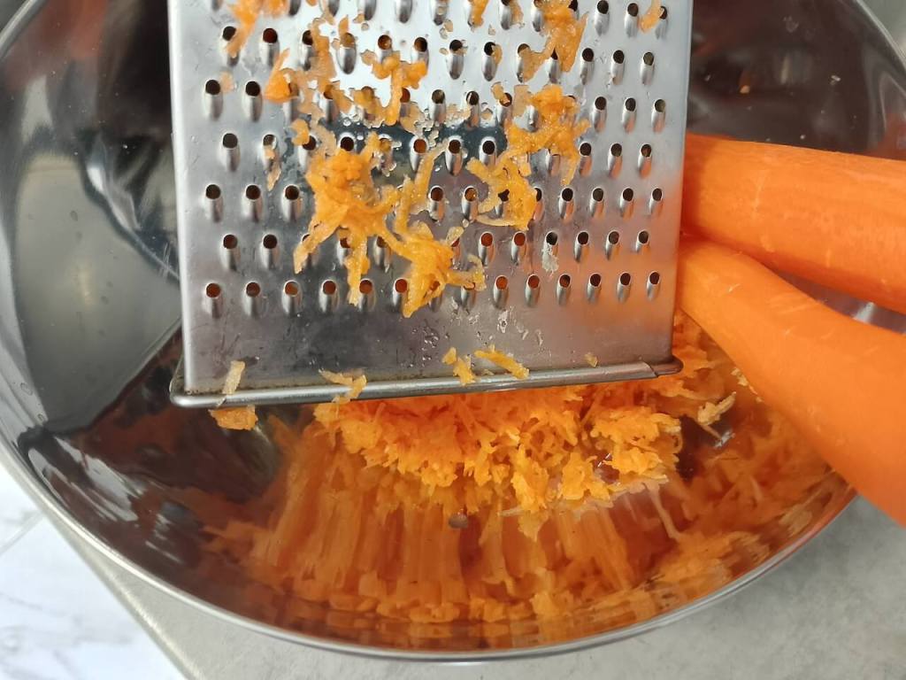 Za početak oljuštite šargarepe i jabuku i izrendajte ih. U jednu dublju činiju umutite viljuškom jaja (za ovaj kolač vam ne treba misker), pa dodajte šargarepe i jabuku.