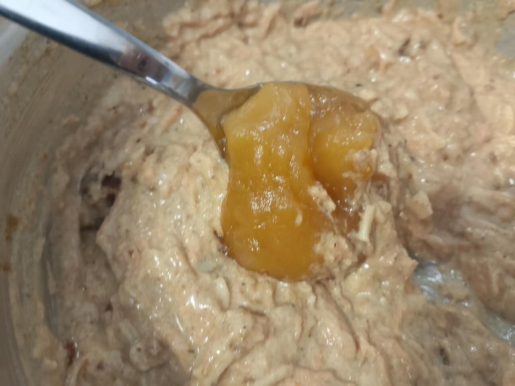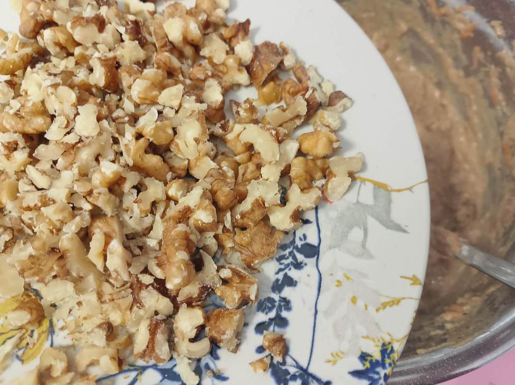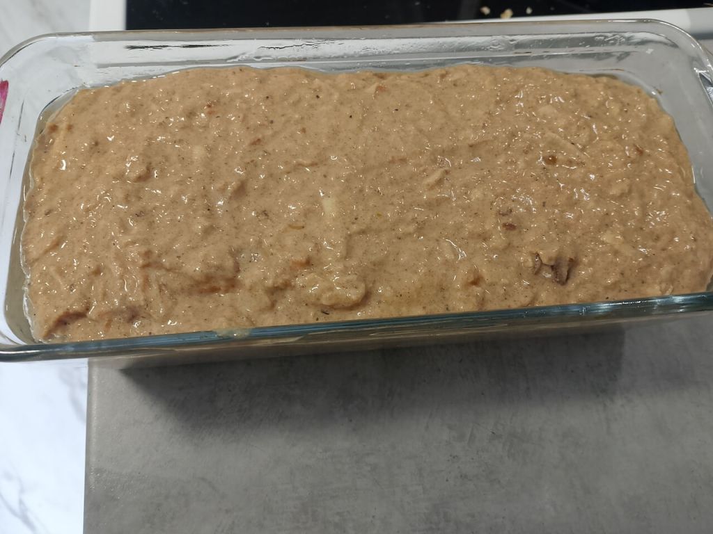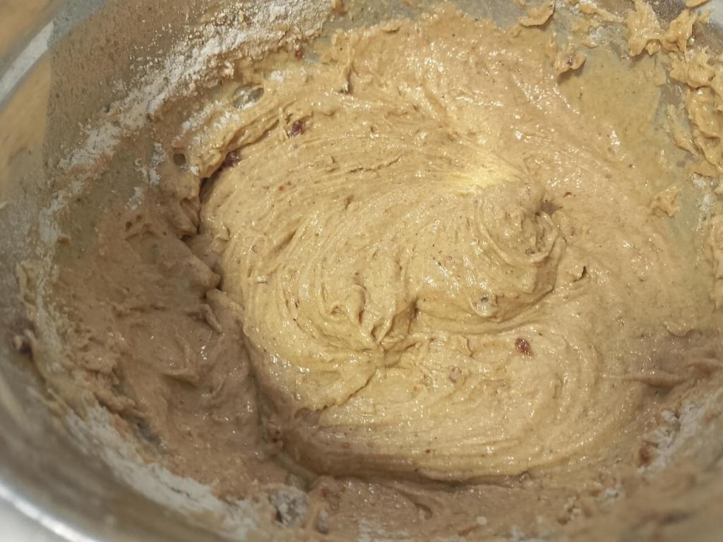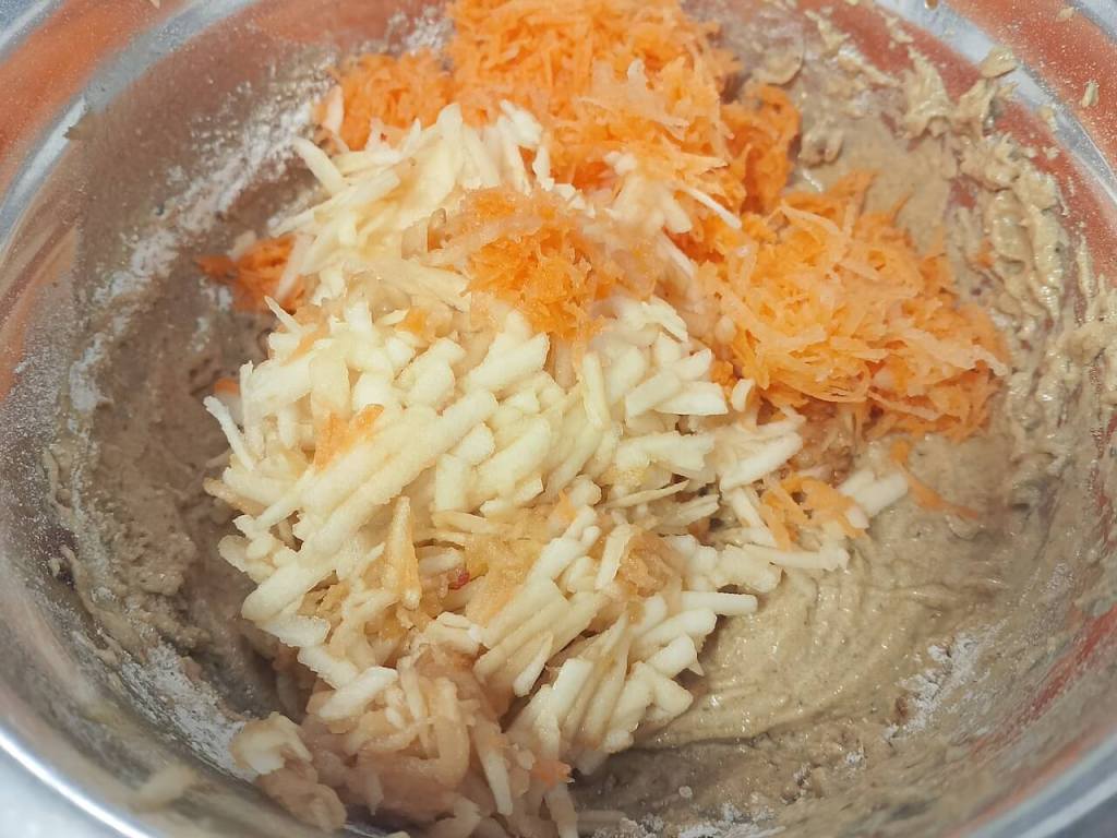 U jaja, rendanu šargarepu, jabuke i urme dodajte sve ostalo (mleko, ulje, PP, med, brašno i seckane orahe) i umutite dobro.