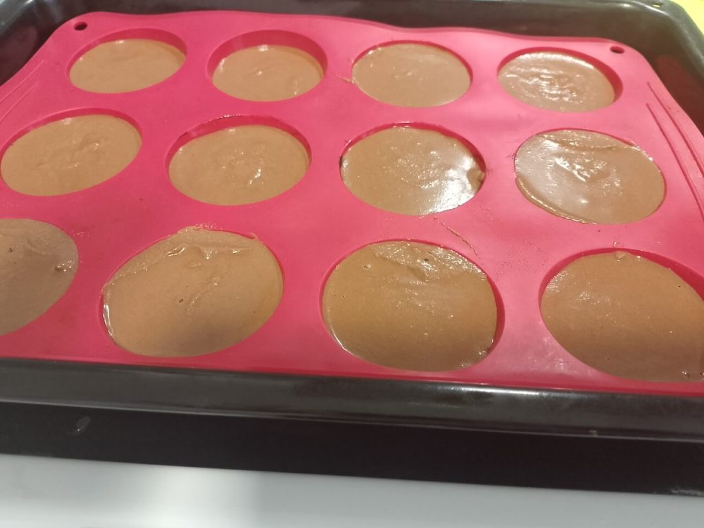 Mleveni keks (lešnik ili orahe) pomešajte sa urmama i dobro umesite. U silkonski kalup stavite količinu te smese taman da pokrijete dno.