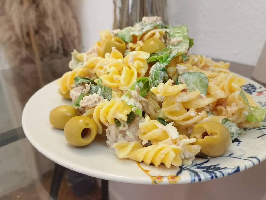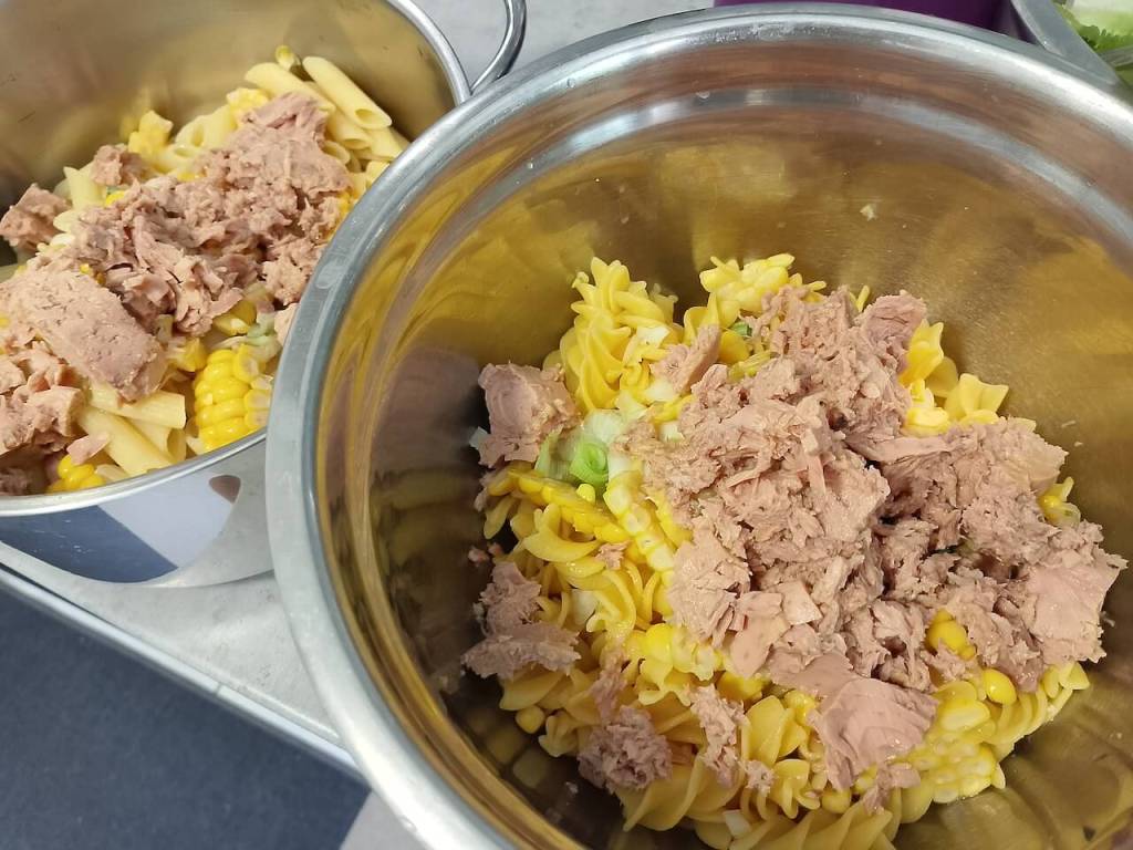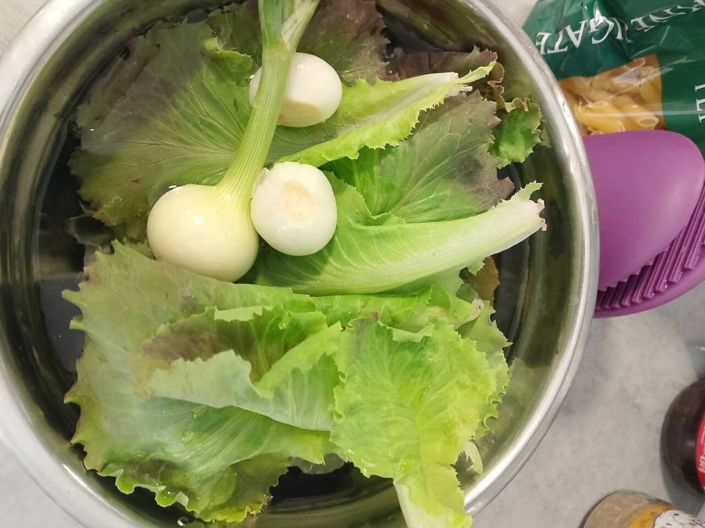 Makarone skuvajte po uputstvu na kesi, ove bez glutena se neki minut duže kuvaju. Ocedite i dodajte sve sastojke redom, ja dodajem prvo seckani luk, ovoga puta je bio iz moje bašte (kao i zelena salata).