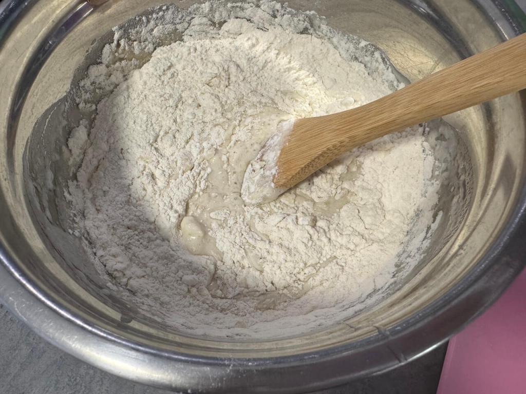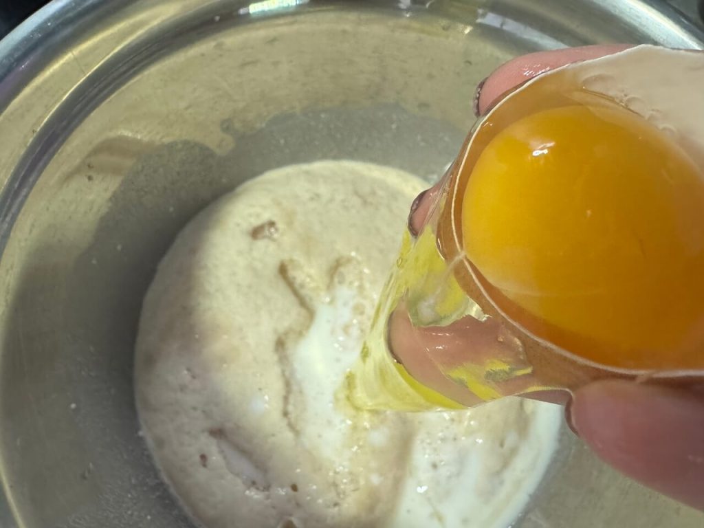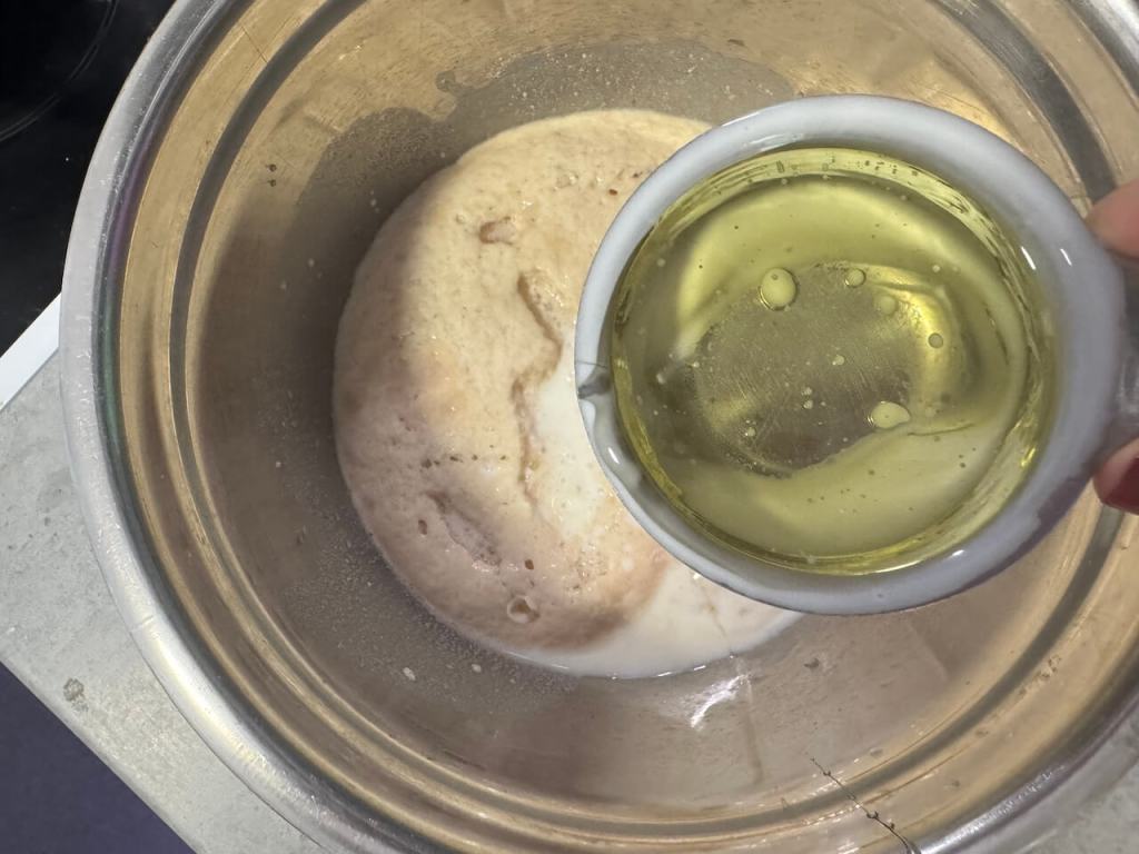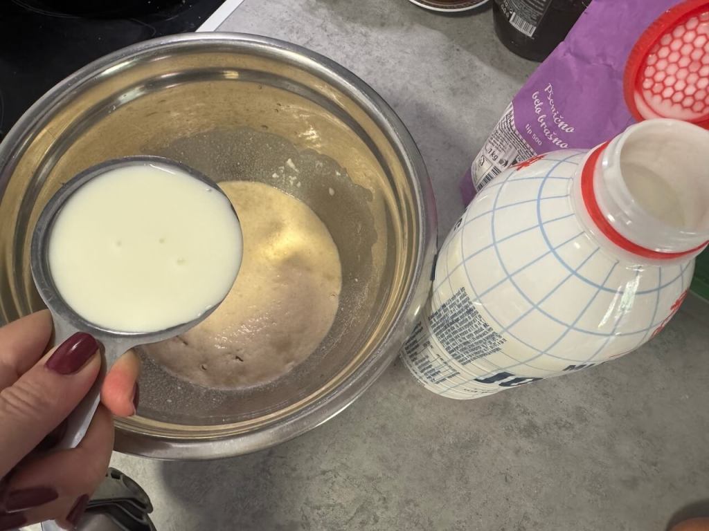 Sada dodati jedno jaje, jogurt, ulje i brašno. Zamesiti testo, pokriti i ostaviti da nadođe (neka se testo duplira).