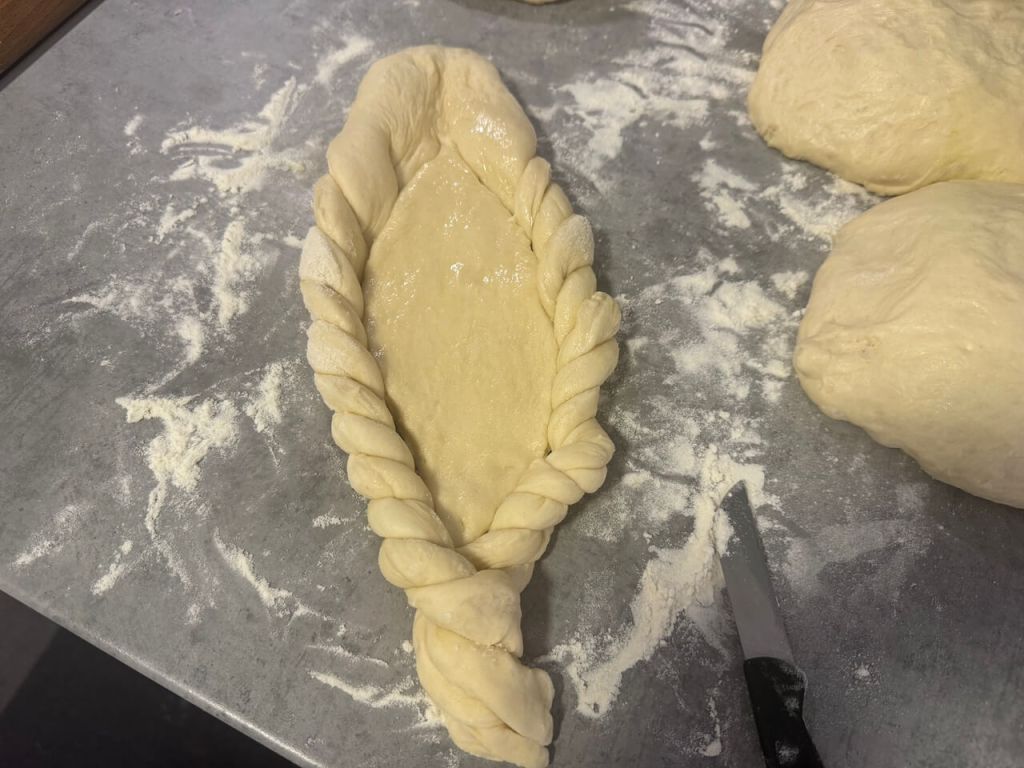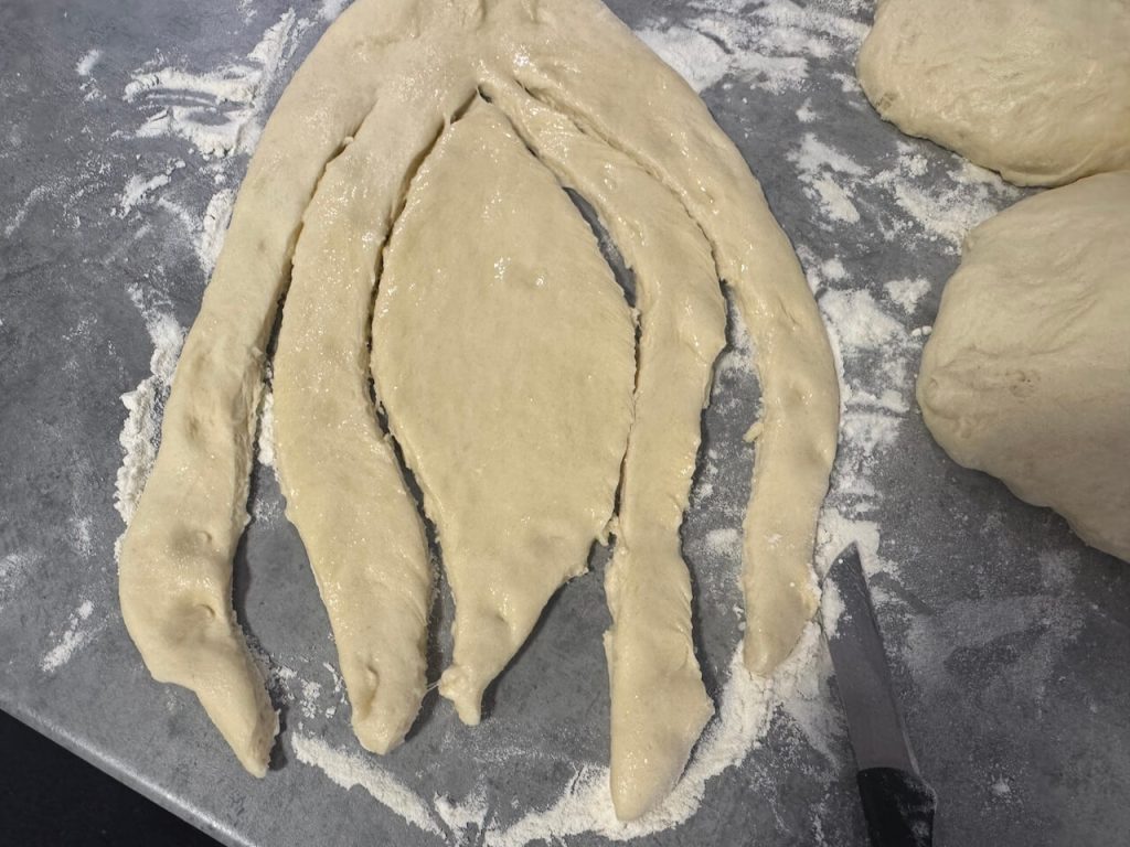 Sada ide formiranje peciva. Jednu lopticu testa razvucite oklagijom u ovalni oblik, pa zasecite ovako kao na slici. Dobićete po dve trake sa svake strane koje bi trebalo da upletete, pa pripojite testu.