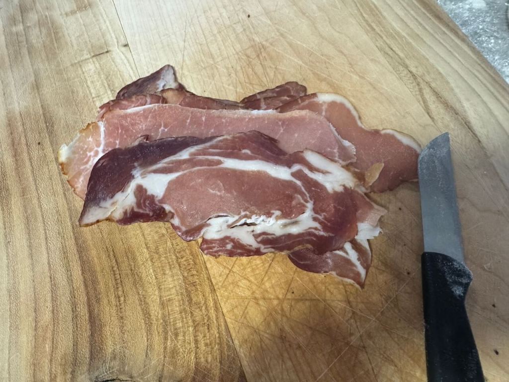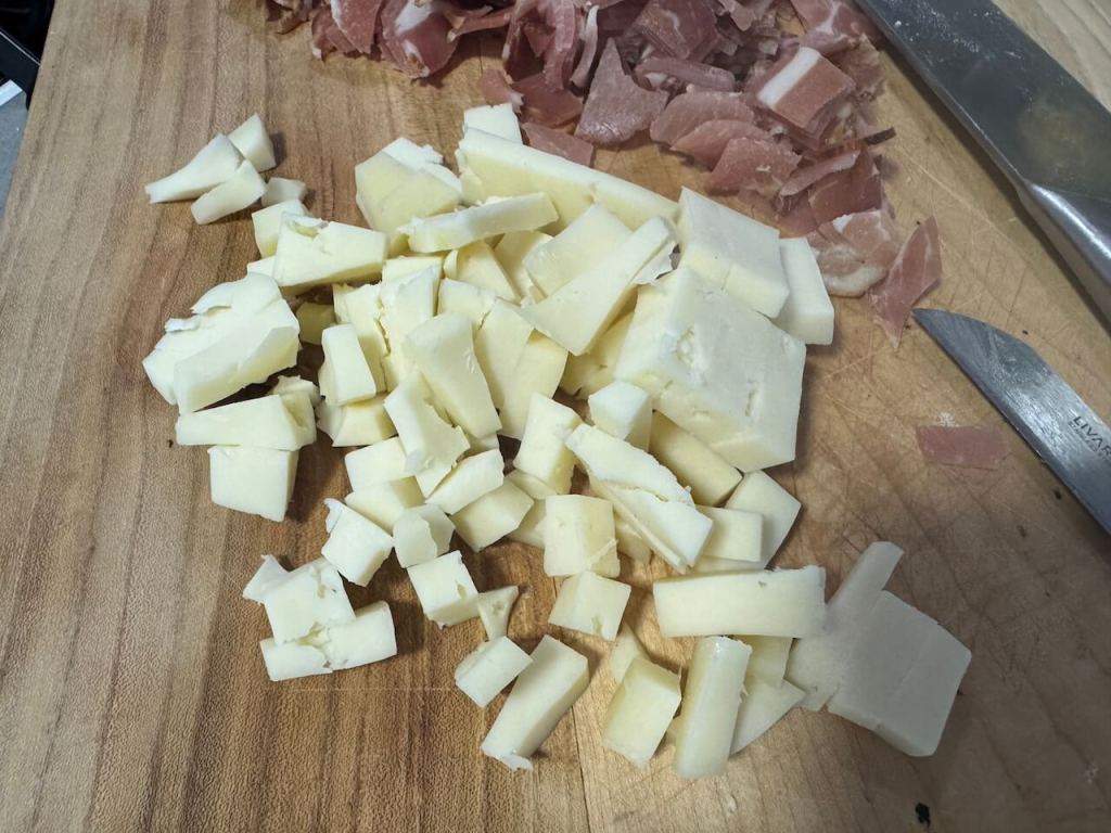 Za vreme dok čekate da još malo narastu spremite fil za pide. Ja sam iseckala na kockice suvi vrat, kačkavalj i kisele krastavčiće.