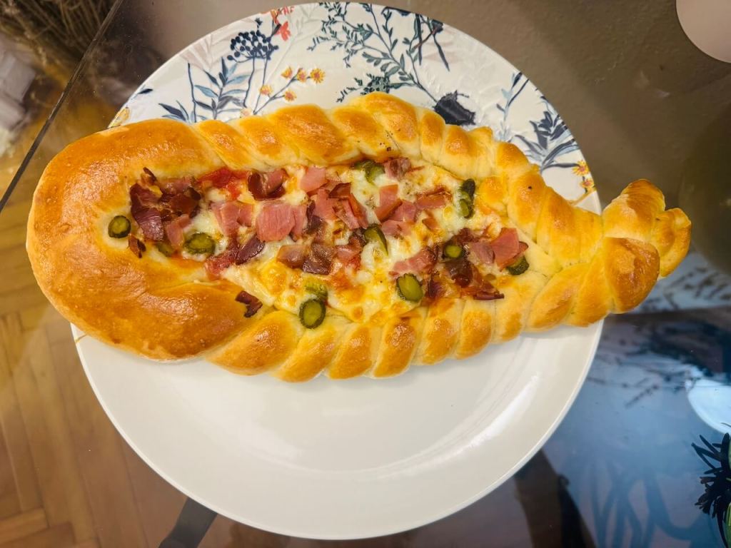 Umutite samo žumance sa malo soli i četkicom premažite ivice samo. Na središnji deo stavite fil (zaboravila sam da napišem da sam preko kečapa stavila malo origana) i vaše pecivo je spremno za rernu. Pecite na 190 stepeni nekih 20 minuta. Videćete kad ivice dobiju lepu boju.