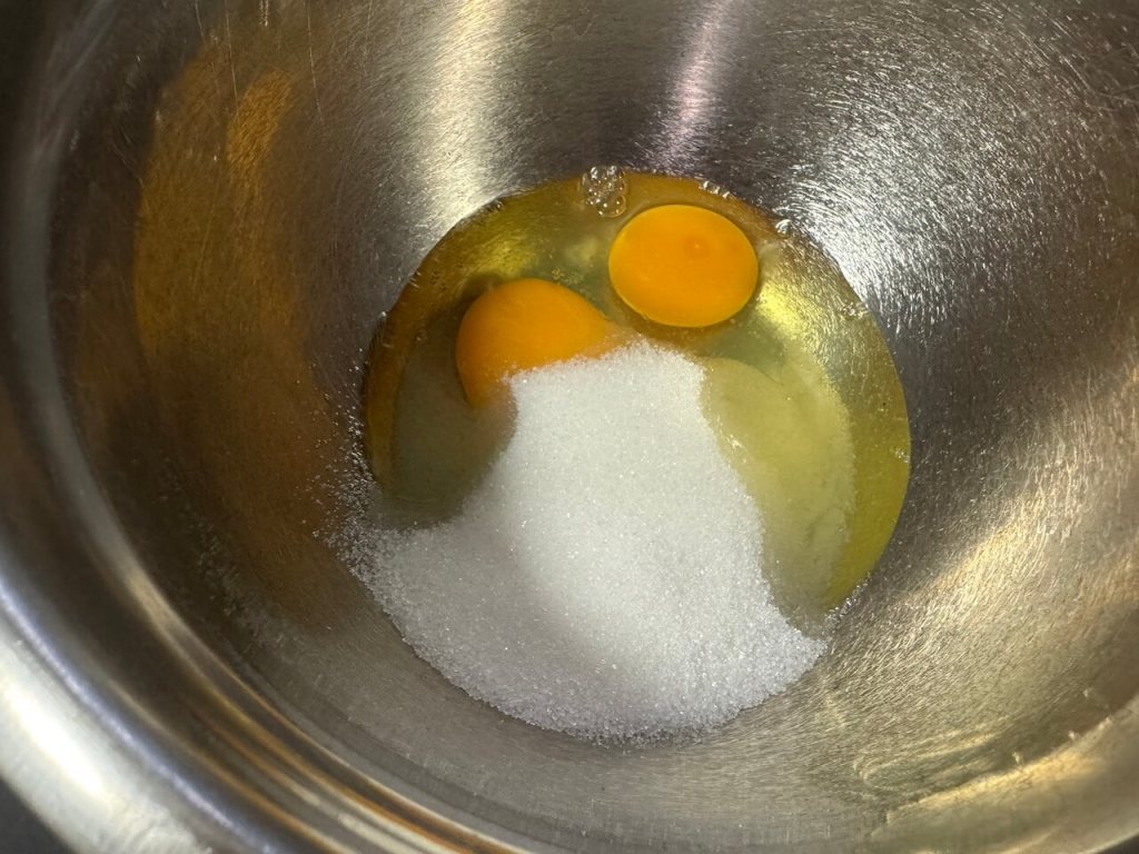 Od sastojaka za koru (jaja, šećer, bademov napitak, ulje, brašno i prašak za pecivo umutimo dobro smesu i razlijemo u pleh. Odmah pre početka mućenja uključite rernu da se greje na 200 stepeni. Ja sam testo pekla u novom silikonskom plehu i mera mi se savršeno uklopila. Silikonski kalup ima prednost jer nema podmazivanja kao kod emajliranih plehova.