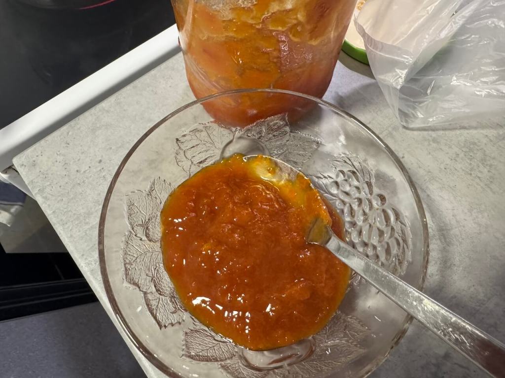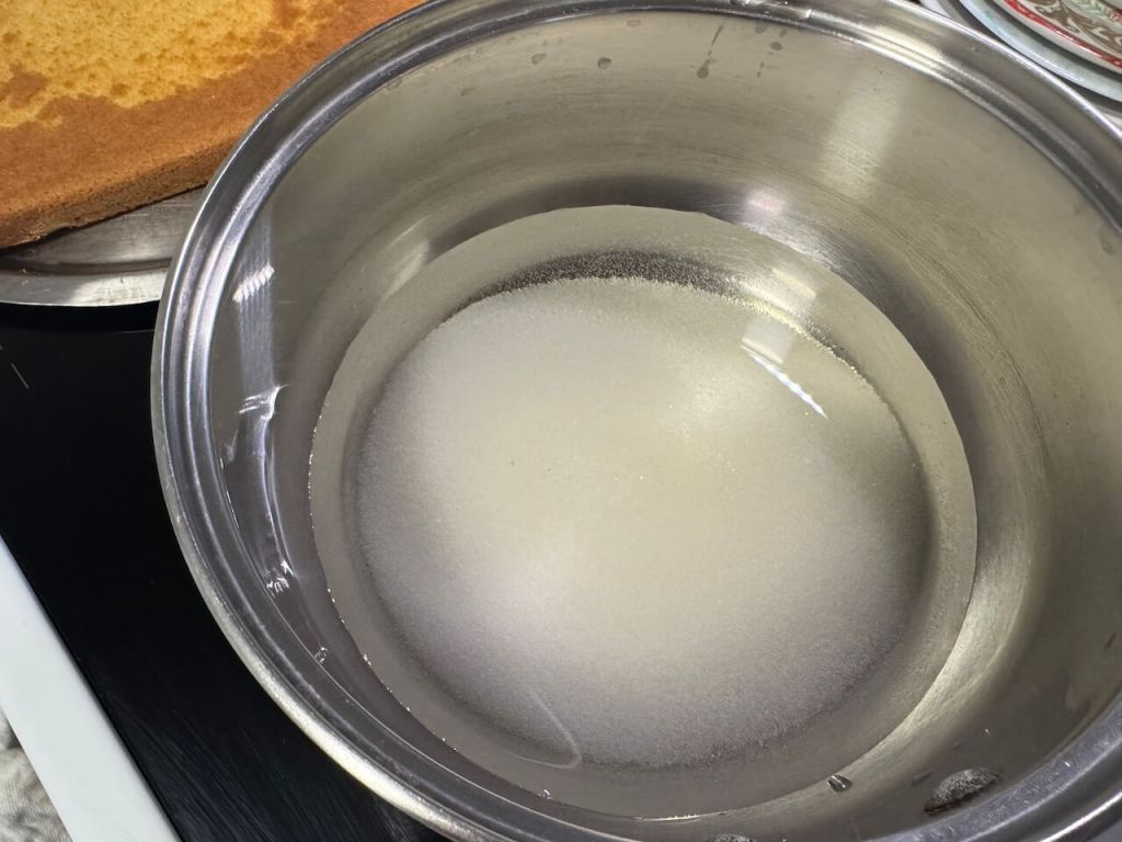 Pravila sam dve kore jer kao što sam napisala mnogo je teže praviti testa bez glutena i bilo bi veoma teško da sam morala jedno ispečeno testo da presečem na pola. To je razlog zašto se peku dve korice. Koru sam pekla prvih 10 minuta na 200 stepeni a ostalih 15 minuta na 180 stepeni. Kada porumeni, kora je pečena, u svakom slučaju pratite jer rerne se razlikuju. Jeste da malo više vremena oduzme ovakav način pripreme ali vredi. Dok vam se peće druga korica počnite sa pripremom sirupa. U jednu šerpicu stavite šećer i vodu i neka se kuva sirup nekih 5 minuta od ključanja, ne više. U ključali sirup dodajte izmrvljenu prvu koru, rendane narandže i džem od kajsija. Mešajte na tihoj vatri par minuta doke ne dobijete homogenu smesu.