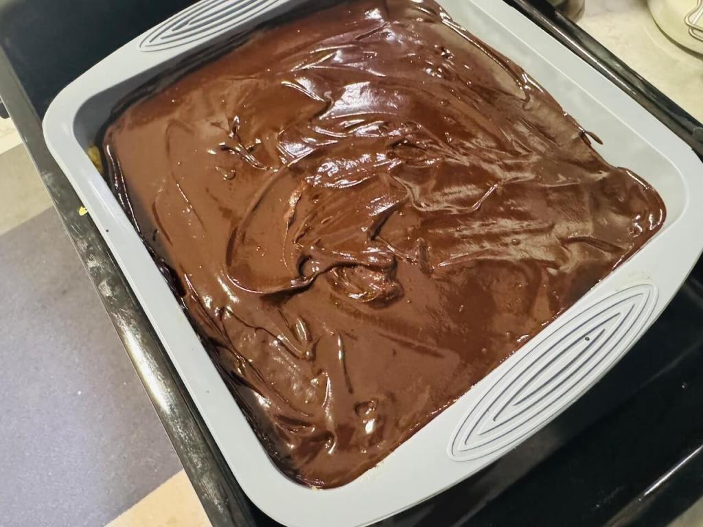 Na pari otopite 150 gr crne čokolade sa 1 dl napitka od badema. Gotovim filom prelijte kolač i ostavite da se ohladi kolač na sobnoj tempetaturi a odmah posle prebacite u frižider.