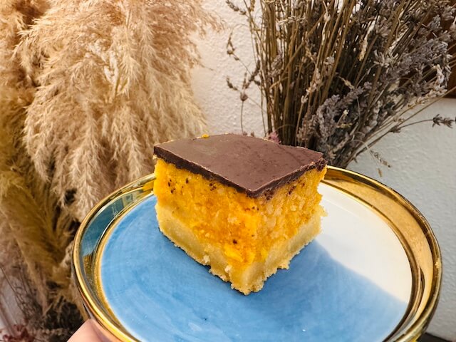 Šta nam je od sastojaka potrebno: za jednu koru (inače pečemo dve), 2 jaja, 8 kašika šećera, 10 kašika bademovog (kokosovog, pirinčanog ili sojinog) napitka, 7 kašika ulja, 10 kašika brašna (ja sam po pola mix bezglutenskog brašna i pirinčanog brašna), pola kesice praška za pecivo. Za sirup: 150 gr šećera i 2 dl vode, 2 zamrznute narandže, 3 kašike džema od kajsija. Za čokoladni preliv: 150 gr crne čokolade i 1 dl bademovog (ili nekog drugog) napitka.