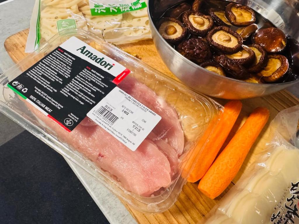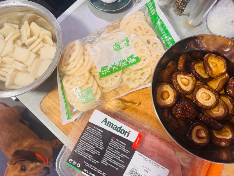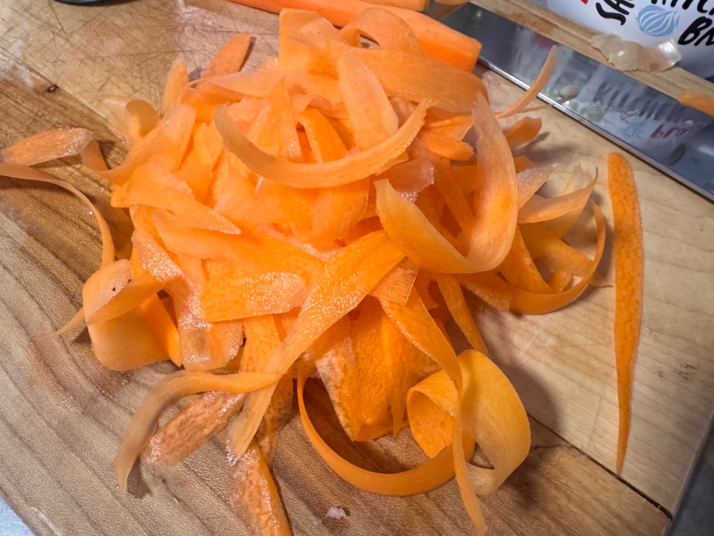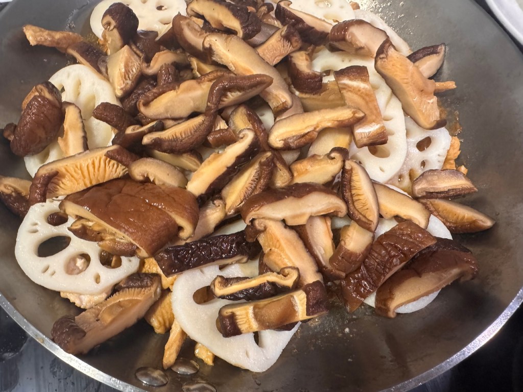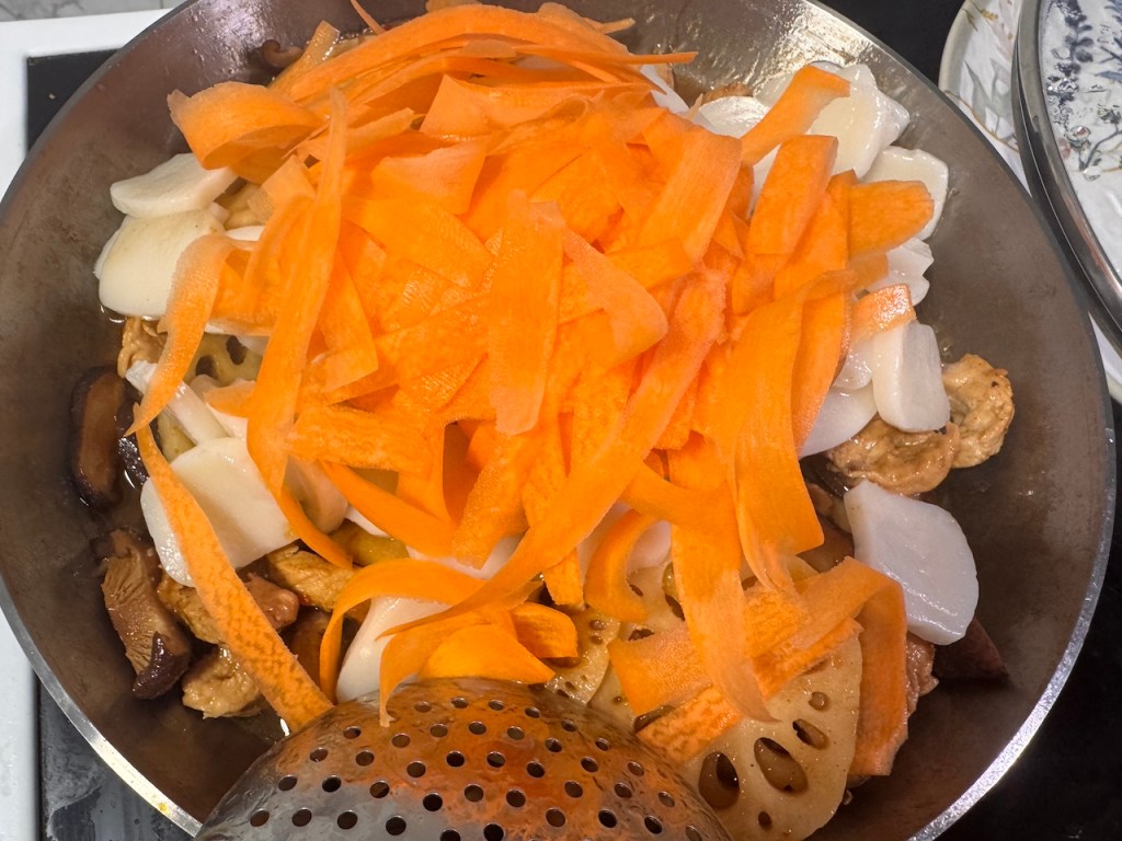 Kada je meso isprženo dobro dodavala sam Iseckane pečurke, lotosov koren, rižine kolačiće i na kraju šargarepu (koja bi trebalo da bude tanko sečena, ja sam je sekla ljuštilicom za krompir).