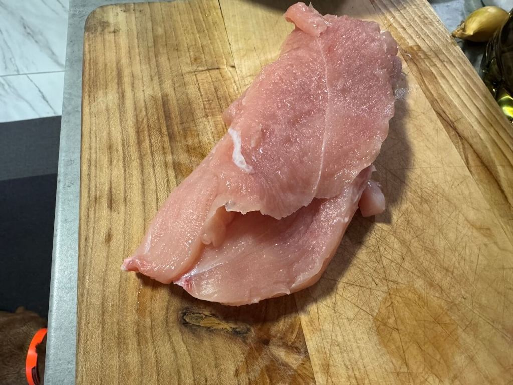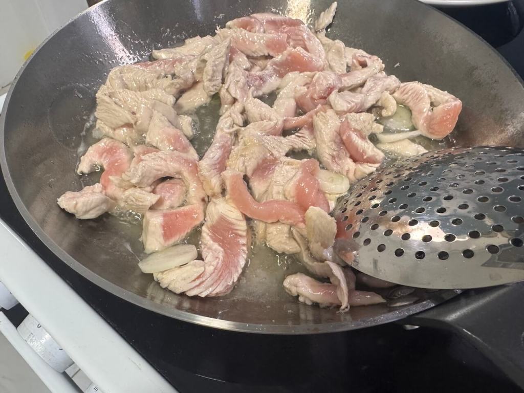 Imala sam ćureće šnicle pa sam meso isekla na žilijen (znači na kose tanje trakice). U tiganj sam stavila malo ulja, dodala meso i iseckanu glavicu luka, dodala malo soja sosa i na tihoj vatri dinstala.