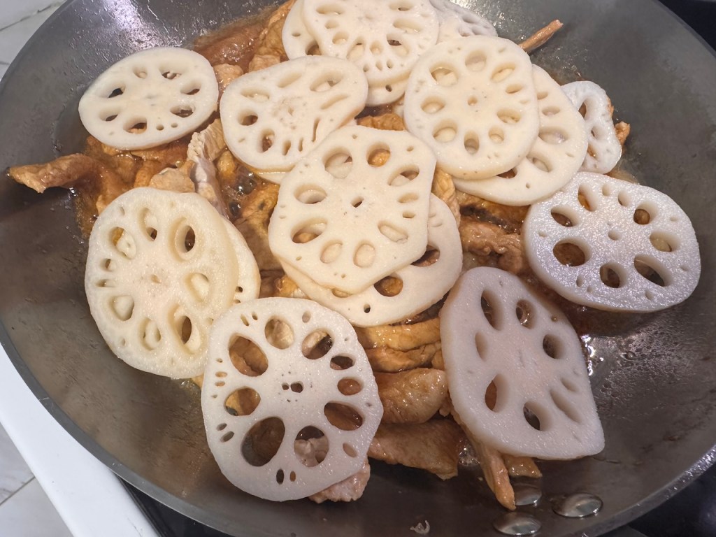 Moje jelo u nedelju je imalo kupus iseckan na kocke a ja sam kupus zamenila lotosovim korenom, koga sam kupila prethodnog puta, sad mi je bila dobra prilika da ga iskoristim.