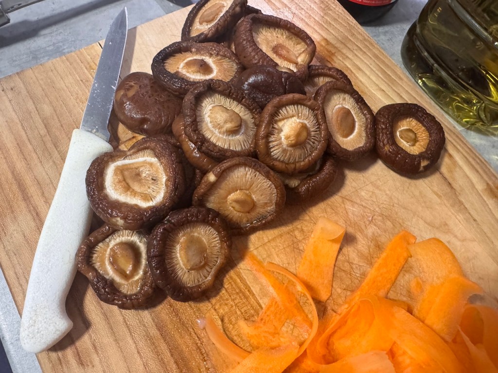 Ukoliko koristite sušene pečurke, ma primer kupite šitake, ostavite ih potopljene u hladnoj vodi najmanje dva sata. Što duže stoje u vodi gube potencijalnu gorčinu. Ukoliko koristite sveže pečurke samo ih isecite. Usput ću vam pisati i cene, na primer ove suve pečurke od 150 gr koštaju 600 dinara. Tu količinu ću imati za pripremu još 5 obroka.