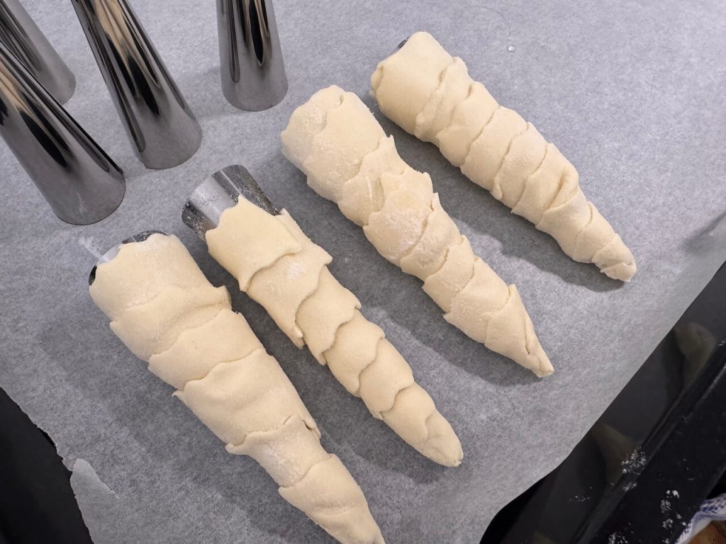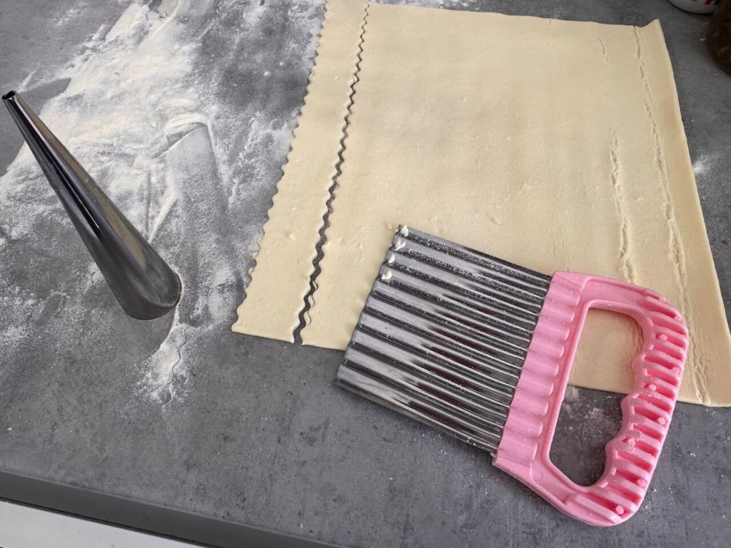 Spremite pleh sa pek papirom a limene kalupe nauljite malo spolja, kako biste lakÅ”e skidali peÄene kornete sa njih kasnije. Sada testo isecite na jednake trake, kojima Äete obmotavati kalup.