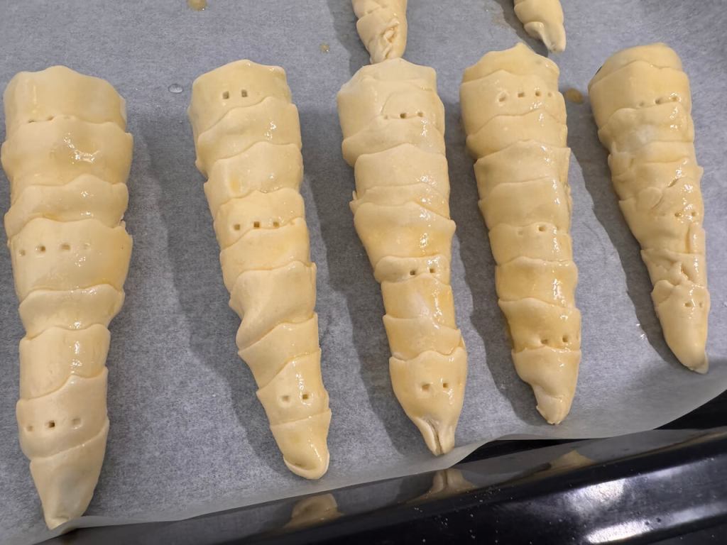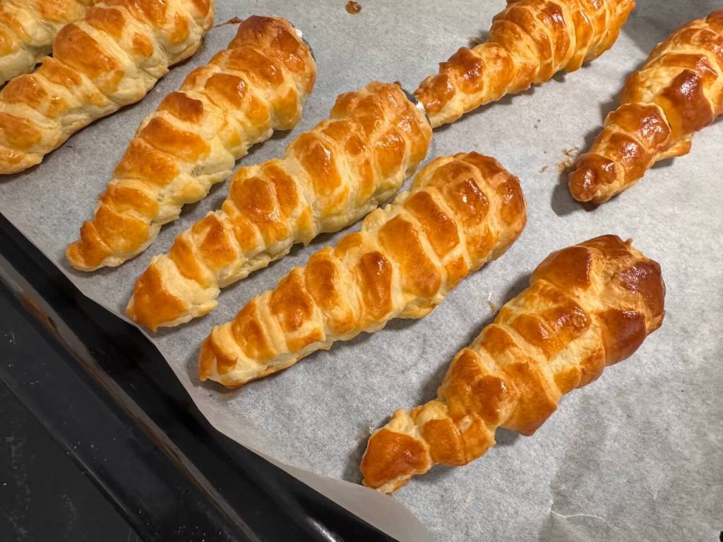 Kada zavrÅ”ite ovo rolanje lisnatog testa umutite jedno jaje pa mu dodajte bukvalno prstohvat Å”eÄera i tim jajetom premažite sa svih strana testo. Može biti i postan slatkiÅ” ukoliko ne premazujete jajetom, jer samo lisnato testo ima margarina u sebi. ViljuÅ”kom sam izbuÅ”ila testo na svakoj modli kako se ne bi tokom peÄenja mnogo podiglo. Pecite u zagrejanoj rerni na 180 stepeni nekih 20 minuta. VideÄete kad dobiju lepu rumenu boju to je gotovo. Ostavite ih joÅ” malo u poluotvorenoj rerni pa izvadite napolje, ali skidajte sa kalupa kad se malo prohlade, posle nekih 5 minuta.