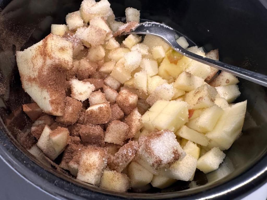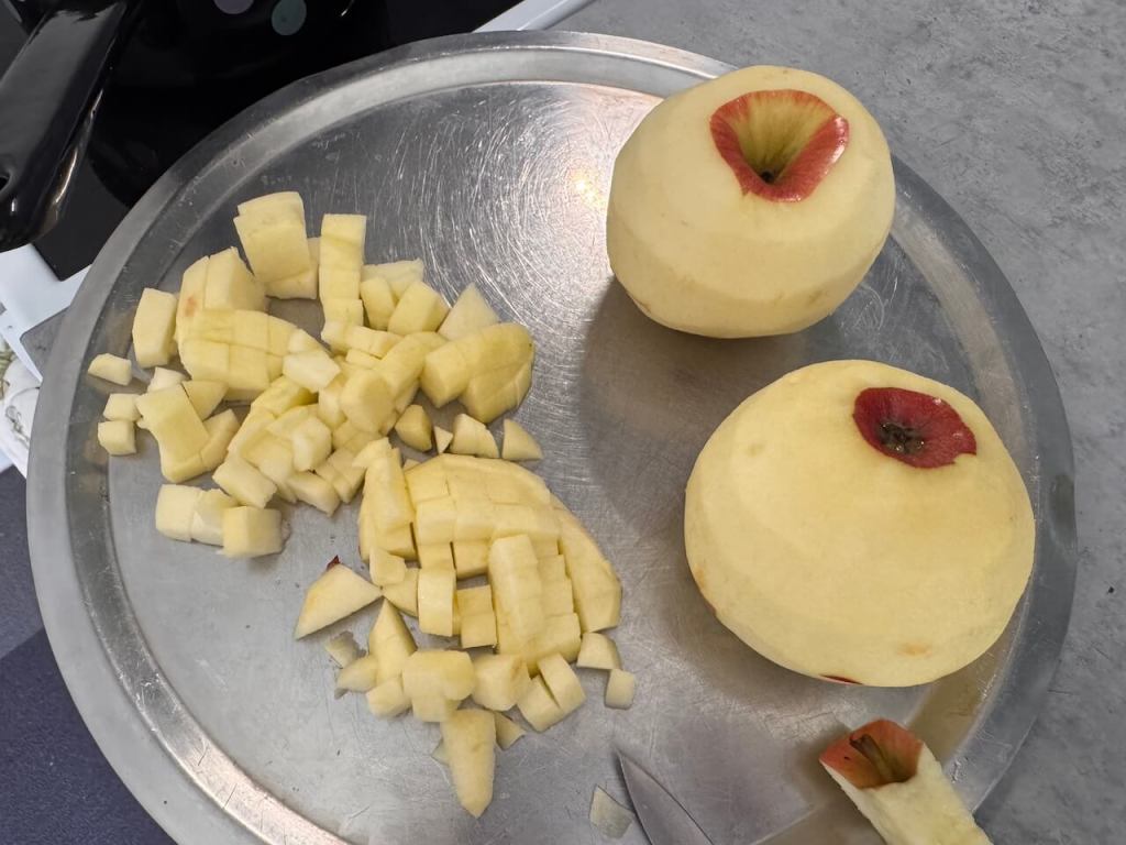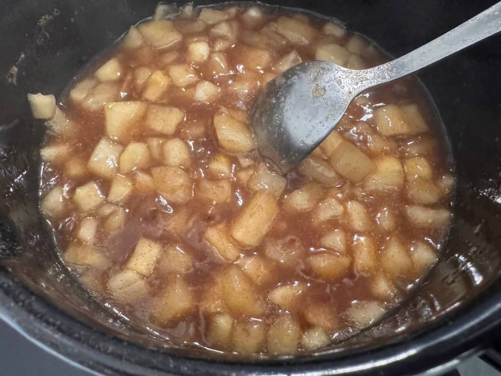 Za to vreme, dok vam se korneti peku, vi oljuÅ”tite dve jabuke, iseckajte na kockice, dodajte 50 ml vode, 3 kaÅ”ike Å”eÄera i kaÅ”iku cimeta (možete i bez njega, ali moji vole cimet). Kuvajte sve to, uz stalno meÅ”anje nekih 10 minuta, videÄete kad smekÅ”aju jabuke.