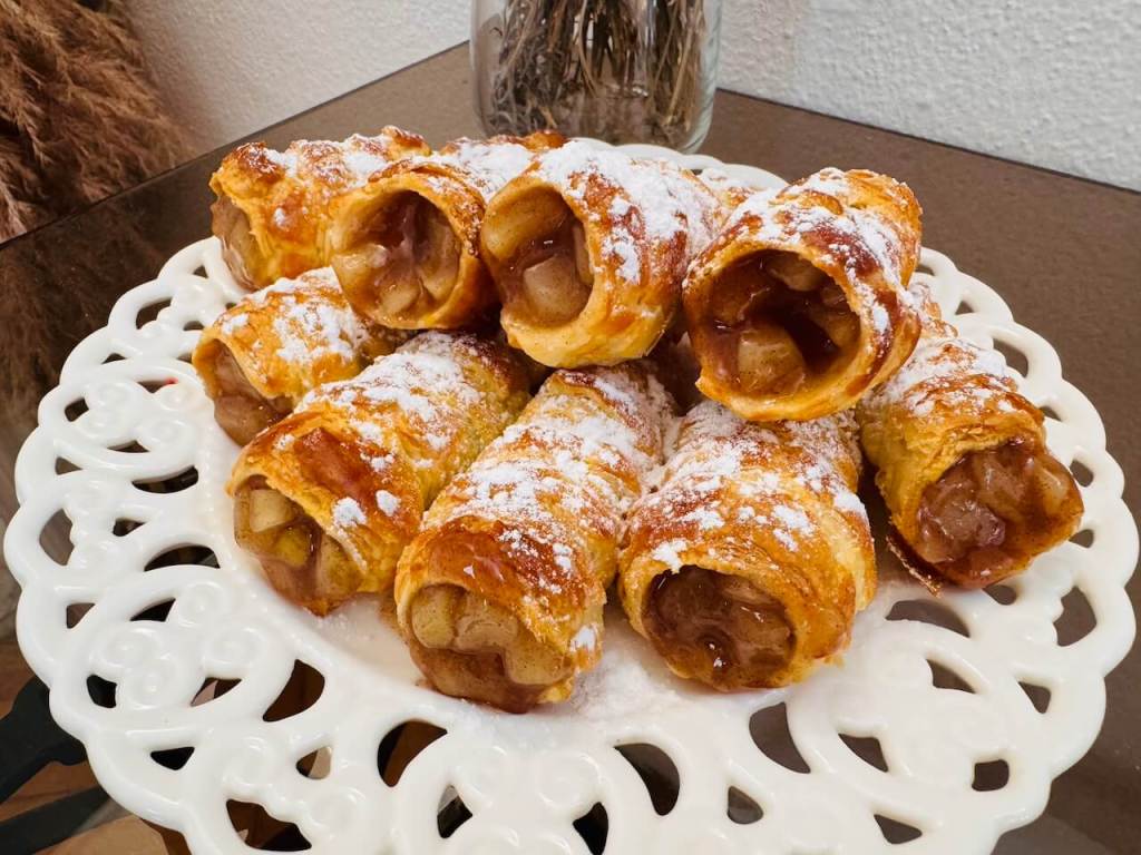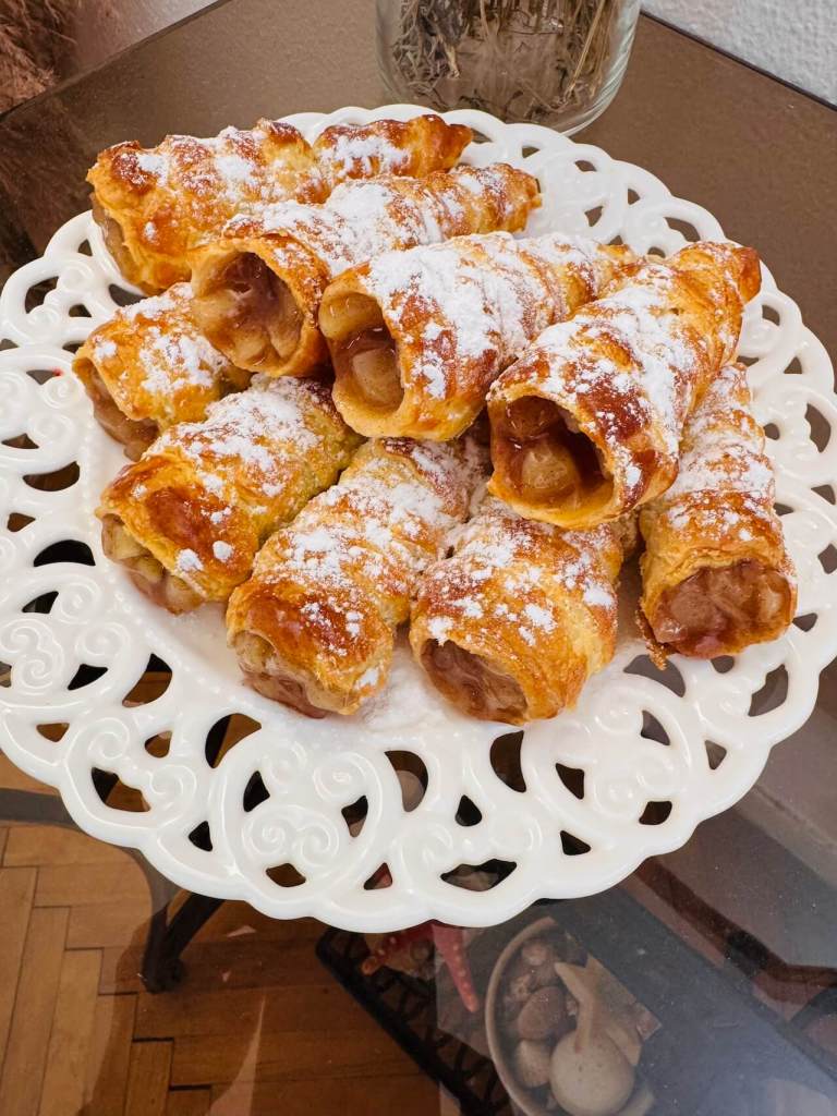 Stiglo nam je proleÄe i ja sam veÄinu vremena napolju, u dvoriÅ”tu ili baÅ”ti, pa tako imam mnogo manje vremena za pripremu slatkiÅ”a i jela koji zahtevaju dosta vremena. Mojim ukuÄanima, koji jedu gluten, a takvih je dvoje, napravila sam veoma lep i ukusan slatkiÅ” koji zahteva bukvalno pola sata vremena. Lisnato testo sam kupila u Lidlu, a ove limene kalupove sam kupila na Temu. Sa ovim kornetima ili fiÅ”ecima od lisnatog testa možete maÅ”ti da pustite na volju pa tako da ih punite slatkim ili slanim filom, izbor je vaÅ”. Ja sam imala jabuke i reÅ”ila da to bude slatko punjenje.