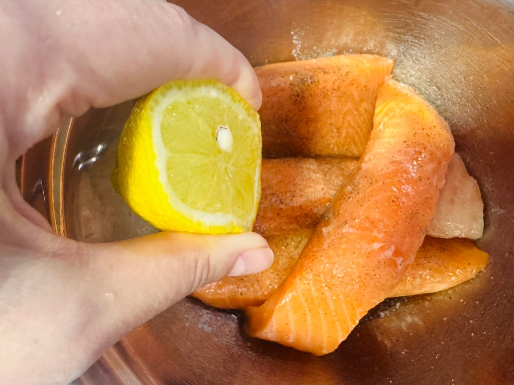 Lososa sam kupila u Ikei, bio je zaleÄen pa sam Äekala da se odledi i stavila u marinadu da odstoji dva sata. Mislim da su najukusnije delicije napravljene veoma jednostavno, bukvalno od par sastojaka, pa sam tako u ovu marinadu stavila maslinovo ulje, so, biber i limunov sok. Možete naravno dodati beli luk, miroÄiju ili neki drugi zaÄin ali ja sam htela da osetim primarne ukuse lososa.