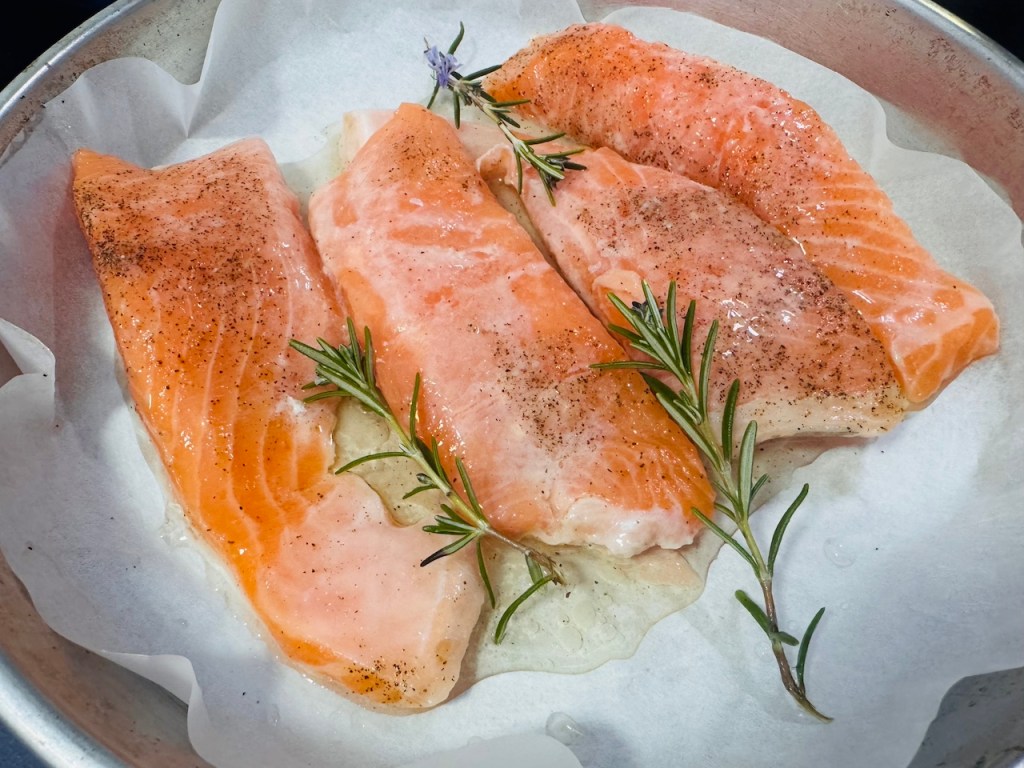 Posle dva sata sam izvukla lososa iz marinade i poreÄala po pek papiru, na plehu u kome Äe se peÄi. Ostatak marinade sam prelila preko ribe. Rernu sam zagrejala na 180 stepeni i tek kada se zagrejala ubacila sam pleh u rernu. PeÄe se riba samo 15 minuta na toj temperaturi. U sluÄaju dužeg peÄenja meso ribe posivi i presuÅ”i se, Å”to nikako neÄete. Krompir salatu sam napravila pre toga.