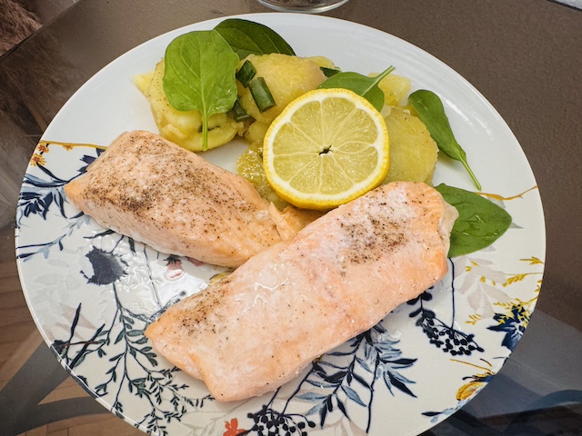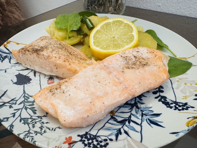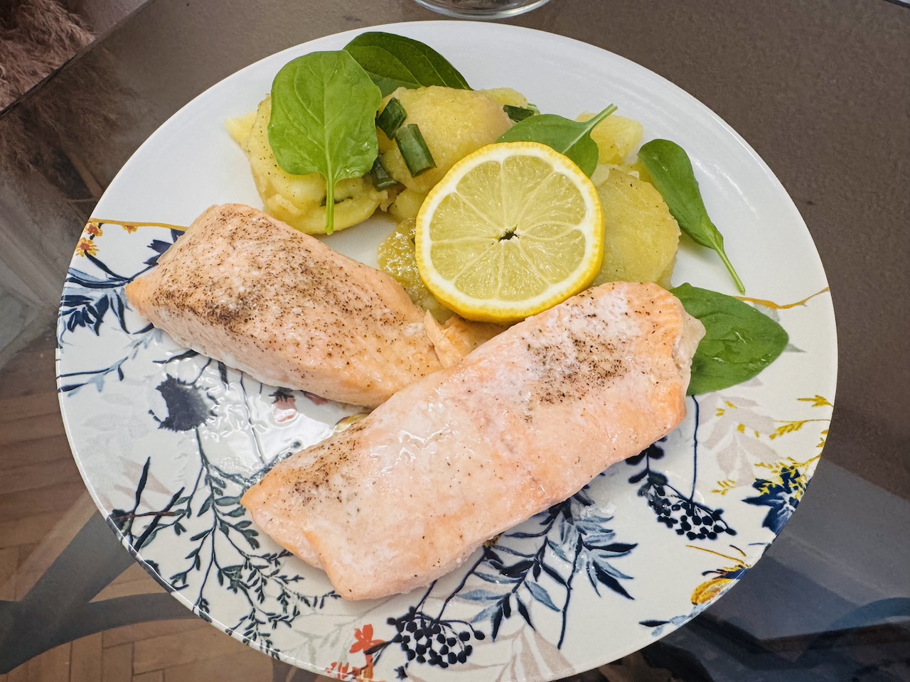 Sada da se vratim na lososa. Verujem da ga veÄina ovako sprema, ukoliko ga spremate, ali uvek ima onih koji se ne usuÄuju da sami prave ovakav obrok misleÄi da Äe neÅ”to zeznuti pa se odluÄuju za restoran. Verujte najduže traje priprema krompir salate.