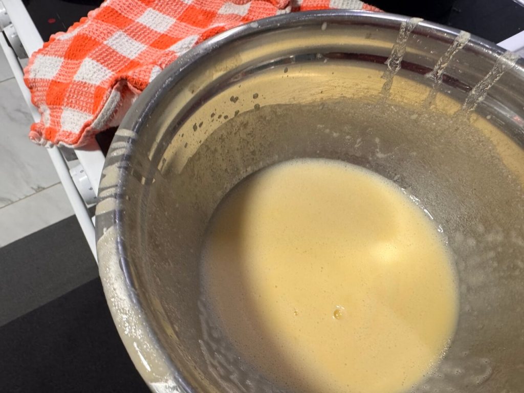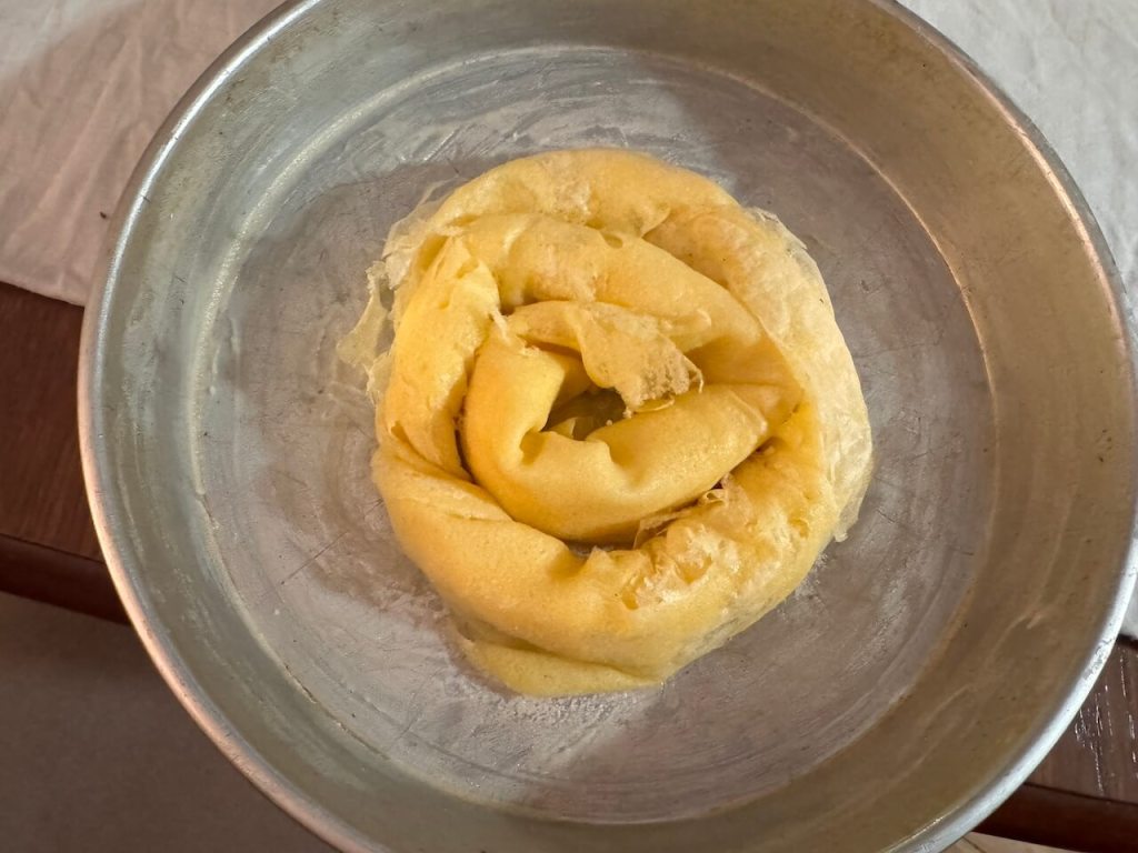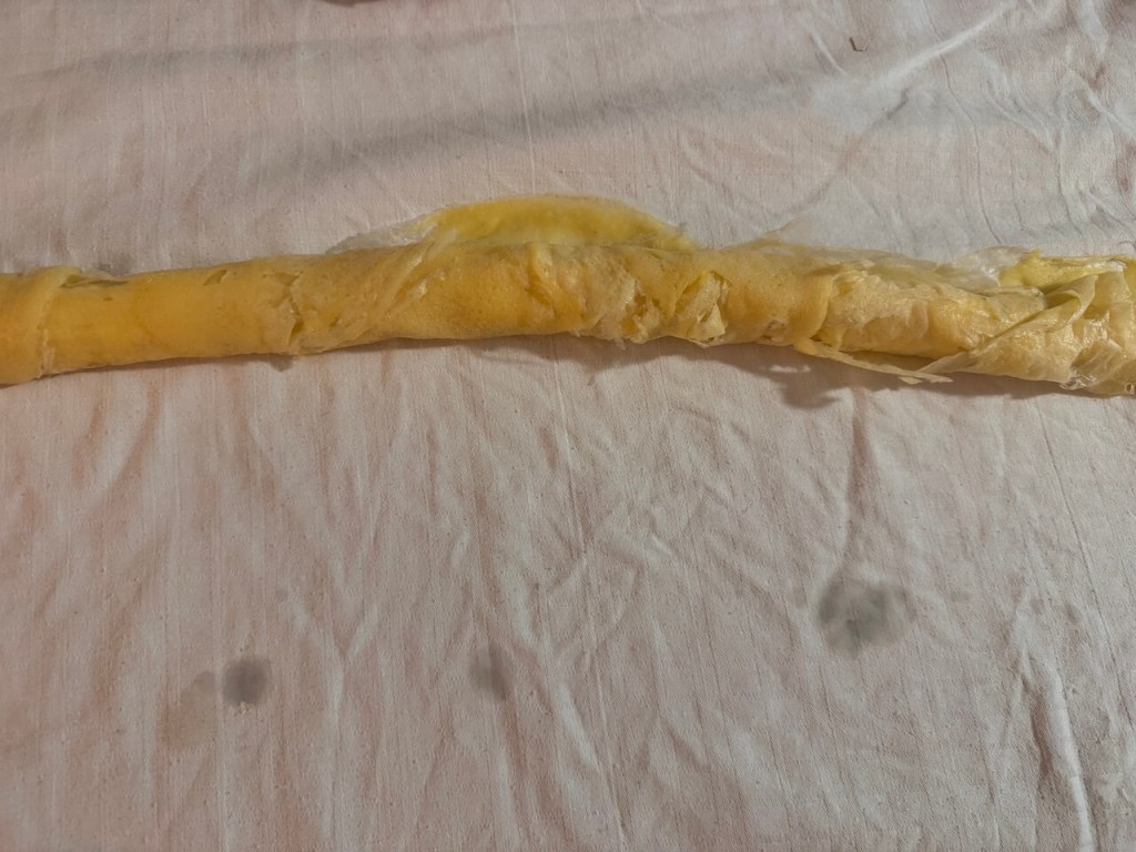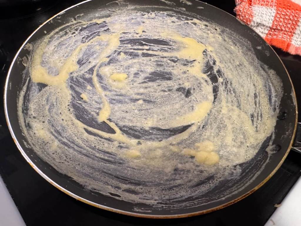 Nemojte brinuti što ovo sve izgleda neugledno, samo morate brzo premazivati tiganj. Palačinku ne pečete sa obe stane, već samo sa jedne, a videćete da je gotova kada krenu ivice da se odvajaju od tiganja. Ređajte ih tako pečene u tanjir i prekrijte ih krpom.