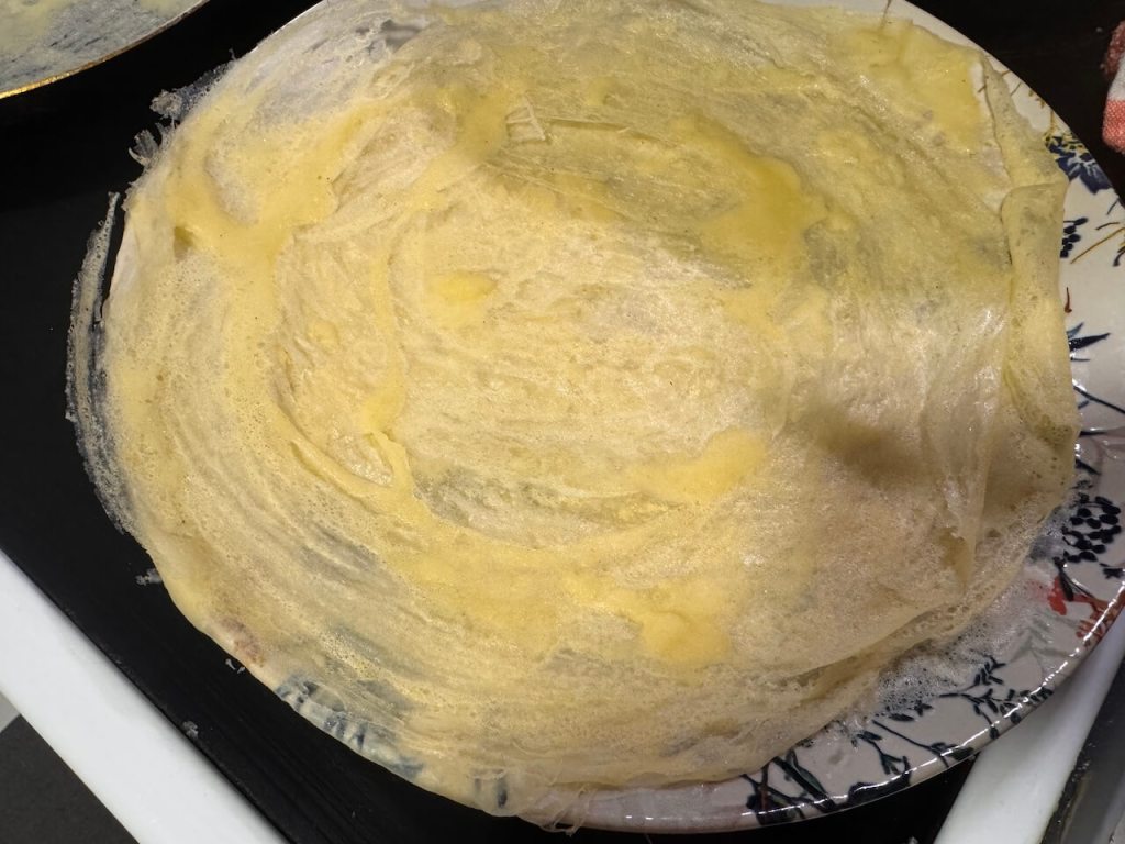 Ove tanke i prozirne palačinke koje sam pekla su zapravo kore za pitu. Testo napravite od 1 jajeta, brašna, vode i ulja. Umutite dobro mikserom i razbijte sve grudvice. Na zagrejan tiganj (samo za prvu palačinku) stavite malo ulja, par kapi, pa četkicom (silikonskom ili drugom) uzimajte testa, i premazujte tiganj. Da biste napravili jednu palačinku trebaće vam više premaza. Sada vatra neka vam bude na srednoj temperaturi. Ukoliko vam testo bude gusto (možda ga premutite mikserom, a znamo da se miksanjem ovo testo zgusne, slobodno dodajte malo vode).