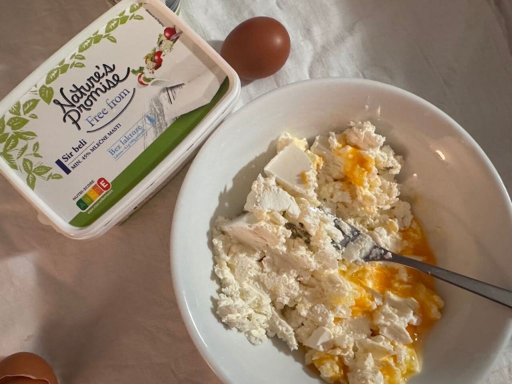 Od ove smese ispadne negde oko 10 palačinki. Sada ide zabavniji deo, a to je filovanje. U principu možete filovati sa čim želite, ja sam radila sa sirom. Fil sam napravila tako što sam pomešala sir, jedno jaje, pola pavlake i malo soli.