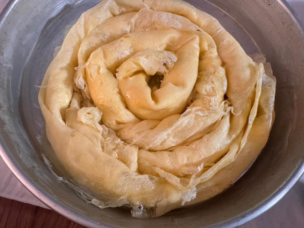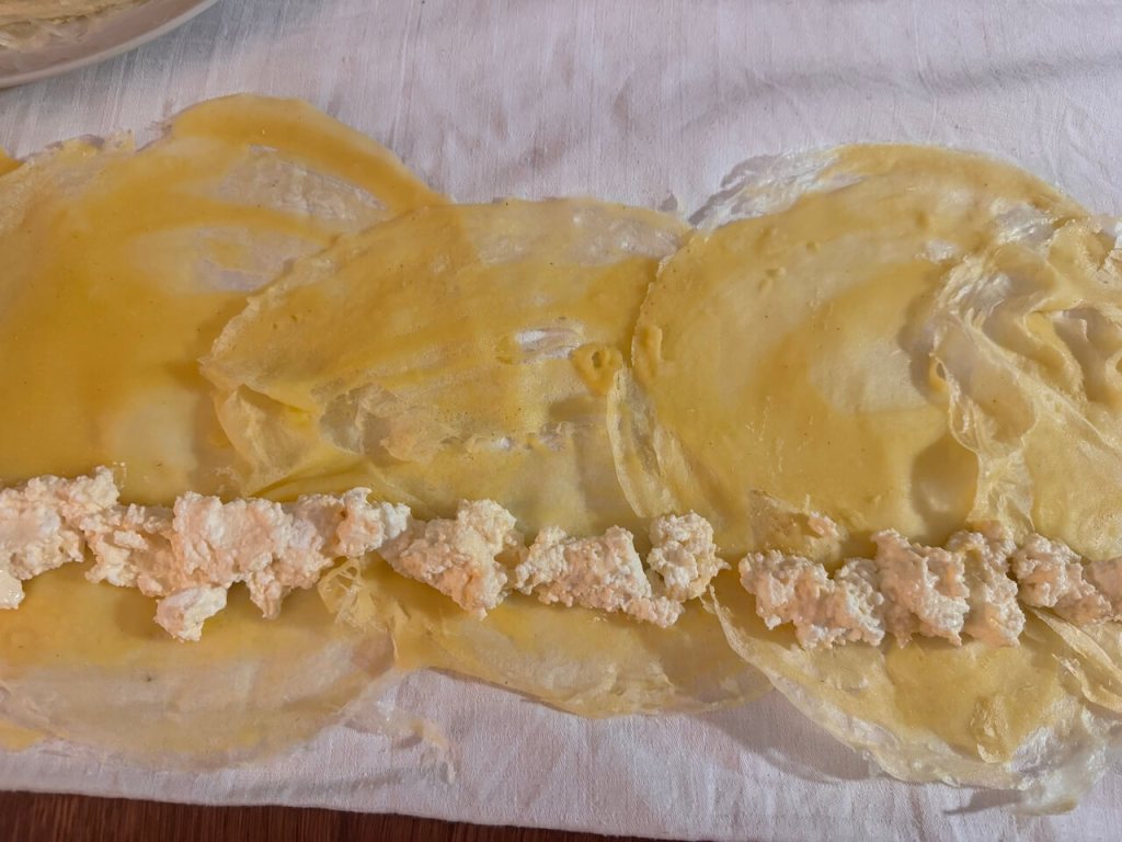 Mislim da sam stavljala po 4 za svaki rolat. Preko stavite fila i uvijte kao rolatić. Taj rolatić uvijete kao što biste uradili sa razvijenim korama i stavite u nauljenu tepsiju. Pa tako ređajte dok imate palačinki i fila.