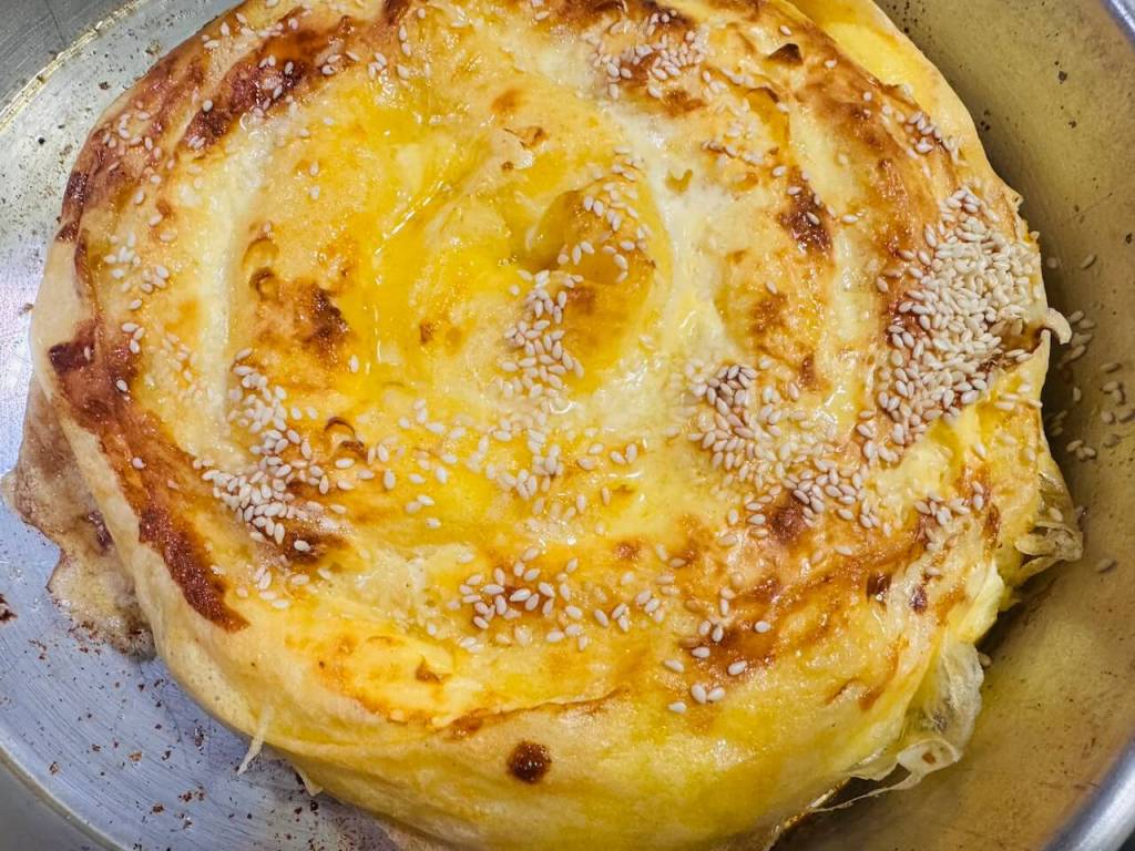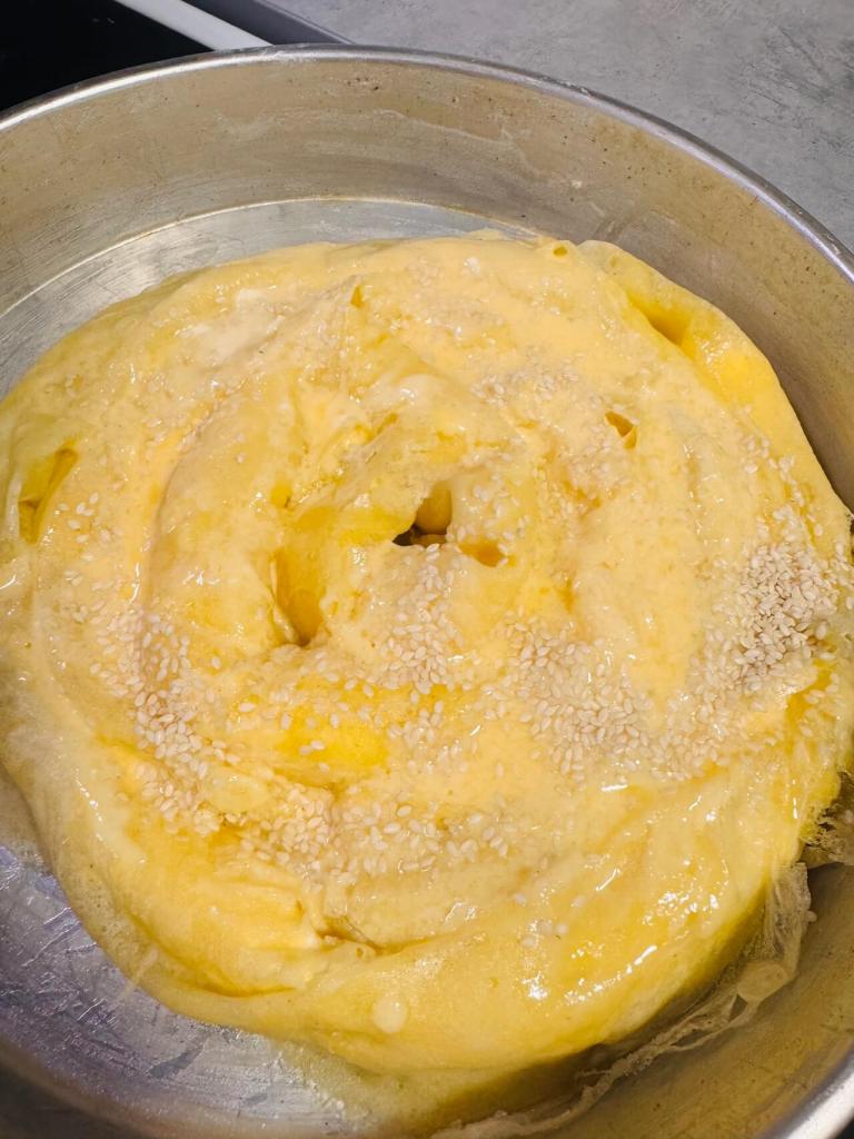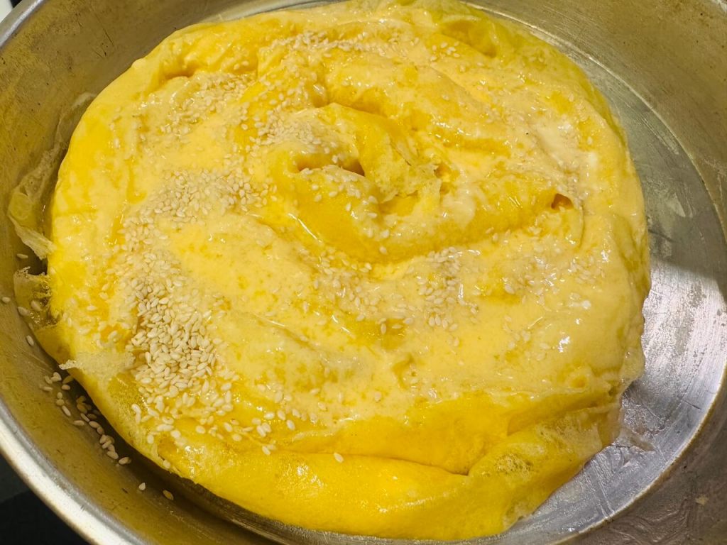 Kada ste završili napravite preliv za pitu od jednog jajeta, malo soli i one polovine pavlake, koja vam je ostala od fila. Prelila sam pitu i stavila preko malo susama.